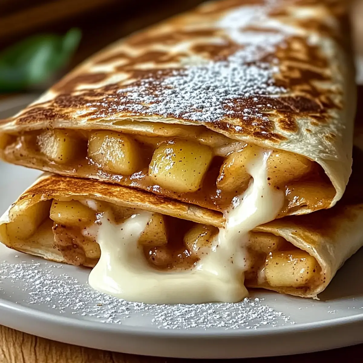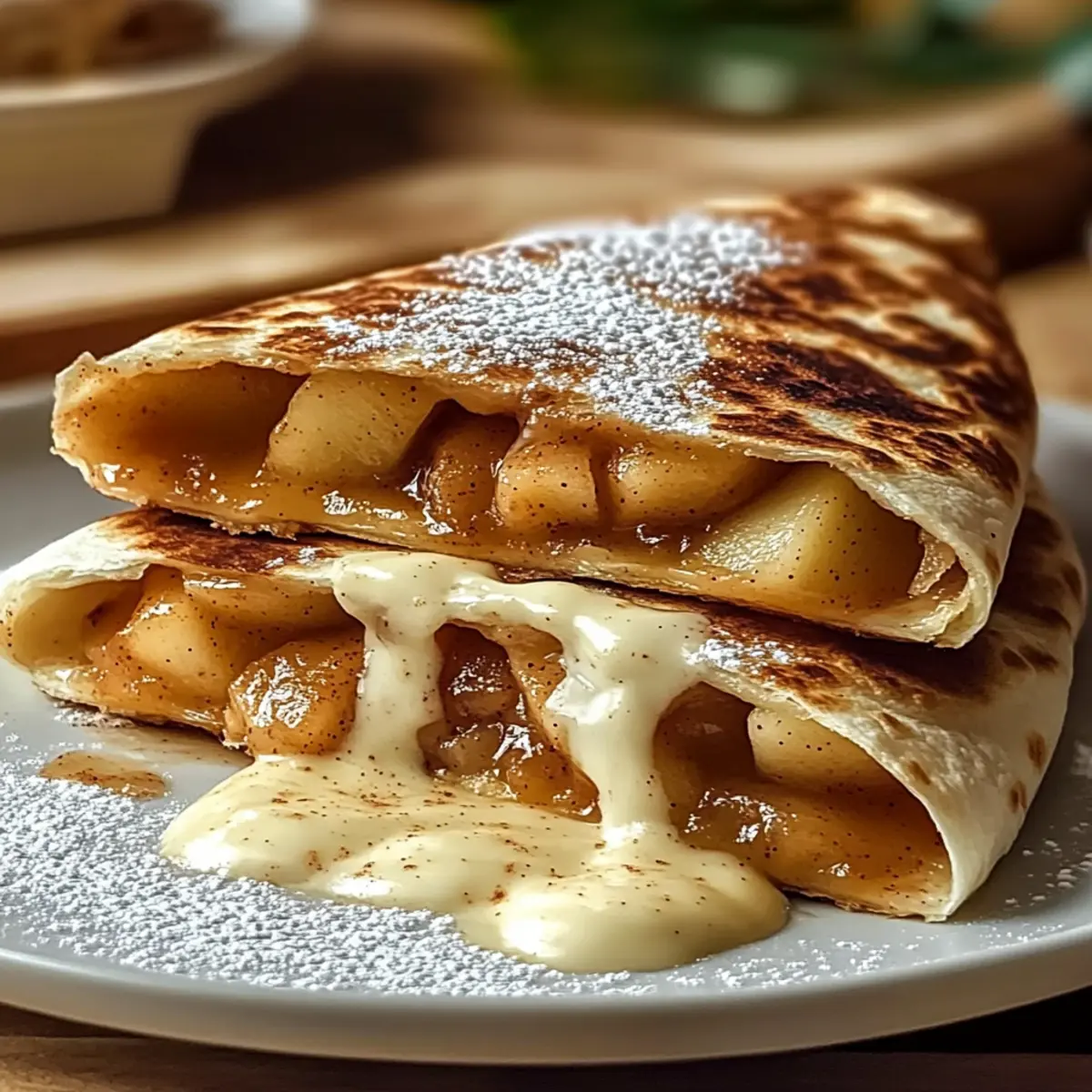 - Lay 2 flour tortillas flat. Spoon half of the apple mixture onto one half of each tortilla. Optionally, add cream cheese or vanilla yogurt on top. Fold the tortillas to enclose the filling.