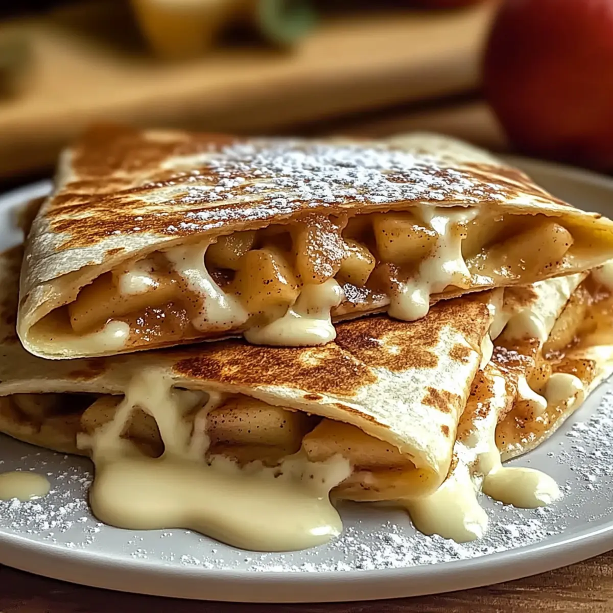 On a clean surface, lay 2 flour tortillas flat. Spoon half of the warm apple mixture onto one half of each tortilla, making sure to spread it out evenly. If you like, add a couple of tablespoons of cream cheese or vanilla yogurt on top of the apples for extra creaminess. Fold the tortillas over to enclose the filling, creating a half-moon shape.