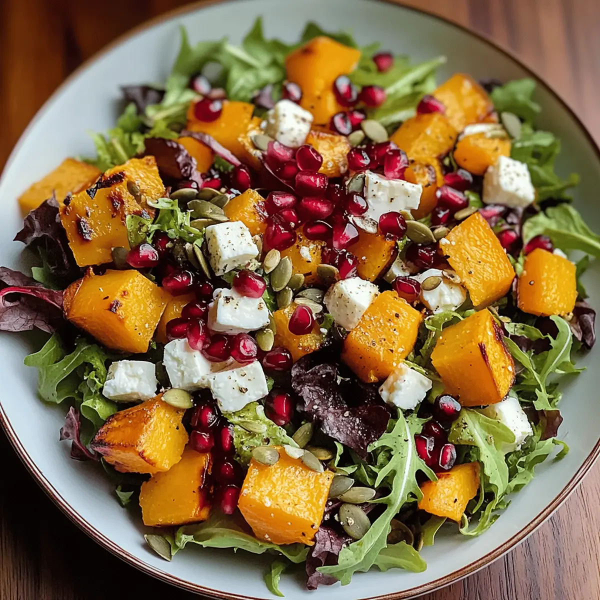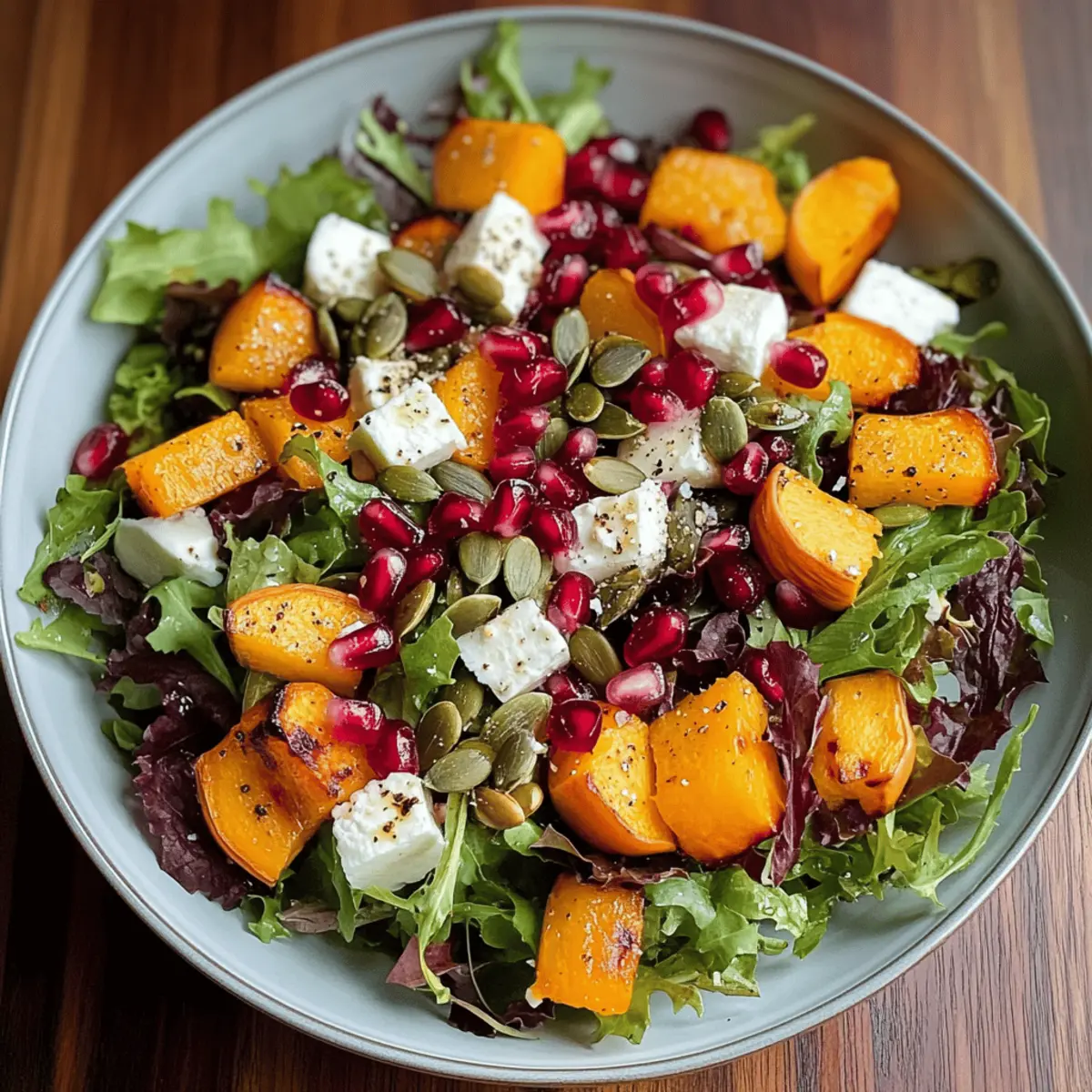 - In a bowl, combine the mixed salad greens with warm roasted squash, pomegranate seeds, feta cheese, pumpkin seeds, red onion, and apple.