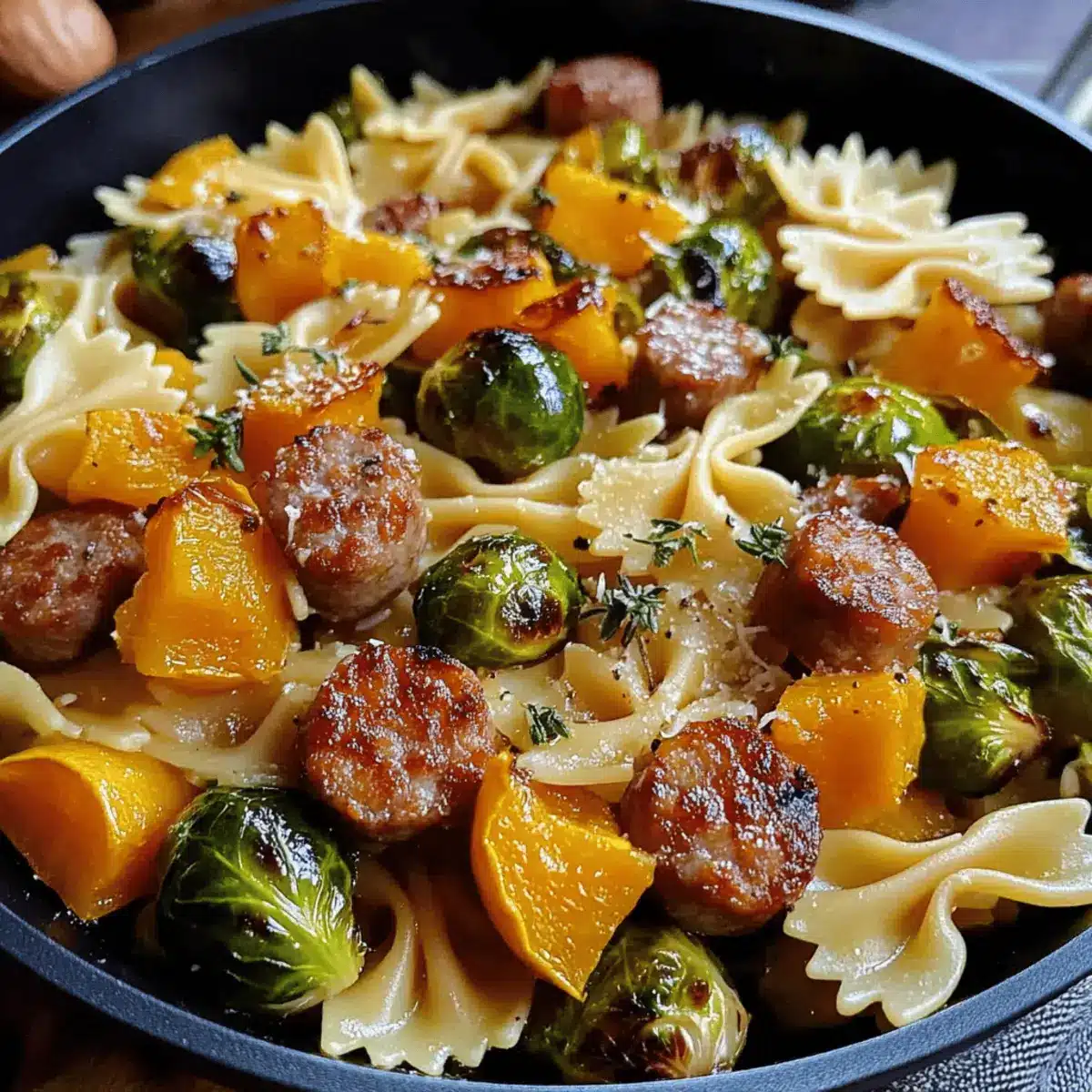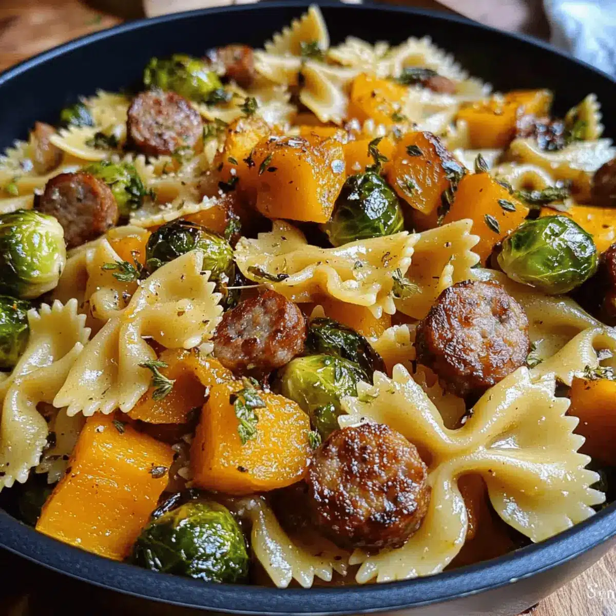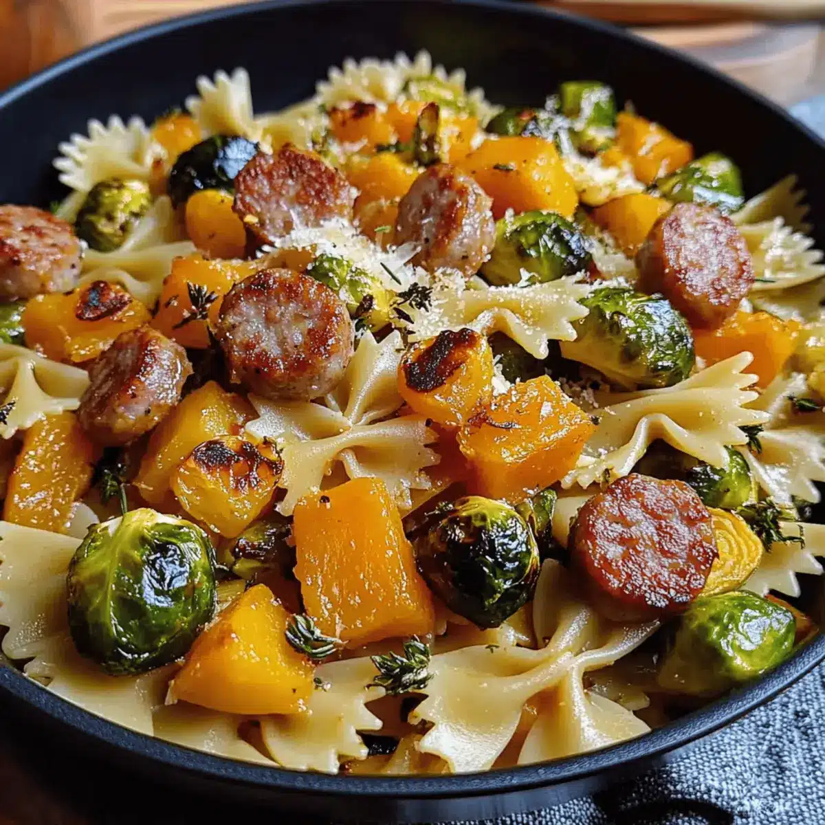 These Autumn Sausage Pasta Squash ingredients are perfect for busy cooks looking to save time! You can prepare the roasted butternut squash and Brussels sprouts up to 24 hours in advance—simply store them in airtight containers in the refrigerator. The pasta can also be cooked ahead, but remember to toss it with a splash of olive oil to prevent sticking. When you’re ready to serve, reheat the roasted veggies in a skillet and then follow the remaining steps to sauté the sausage, create the garlic butter sauce, and combine everything. This allows you to enjoy all the comforting flavors of the Autumn Sausage Pasta Squash with minimal effort during your hectic week!