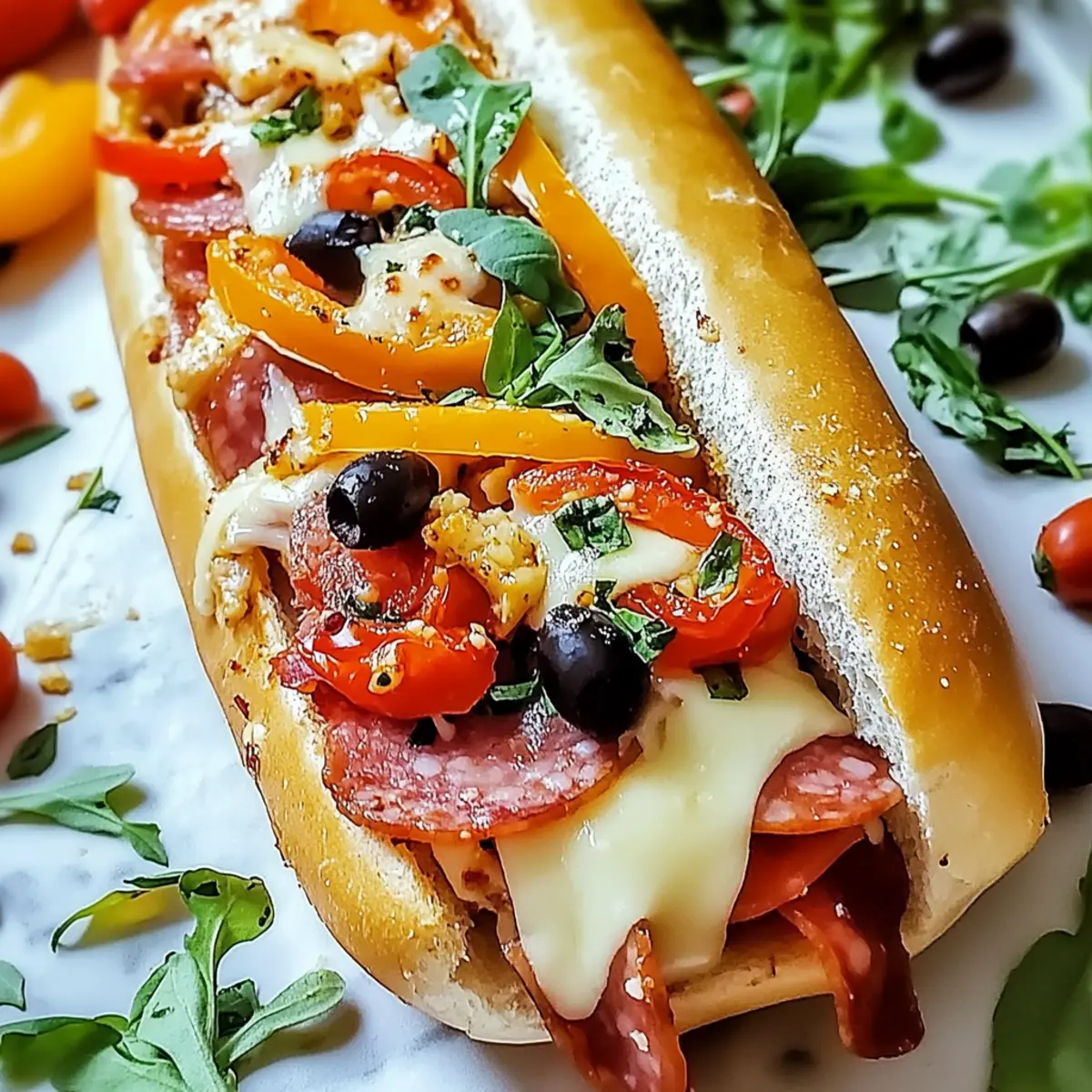 Once the cheese layers are set, distribute sliced roasted red peppers over the top. Follow this with sliced black olives and banana peppers to add a tangy crunch. Each topping contributes a unique flavor, enhancing the overall experience of the Baked Italian Grinder Sandwiches.