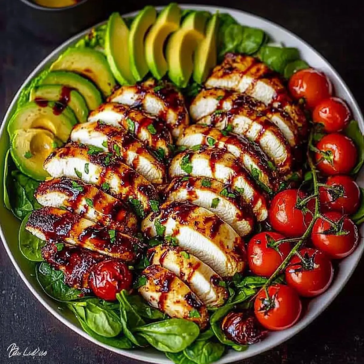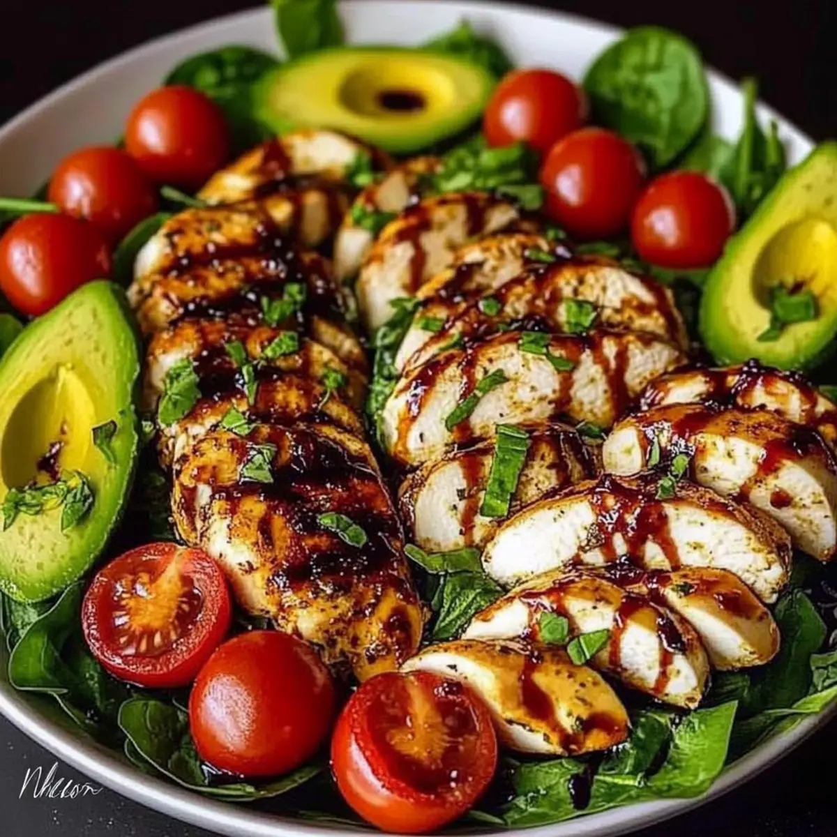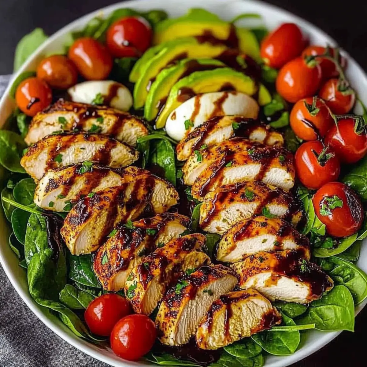 - Assemble the salad with spinach, chicken, mozzarella, avocado, and tomatoes.