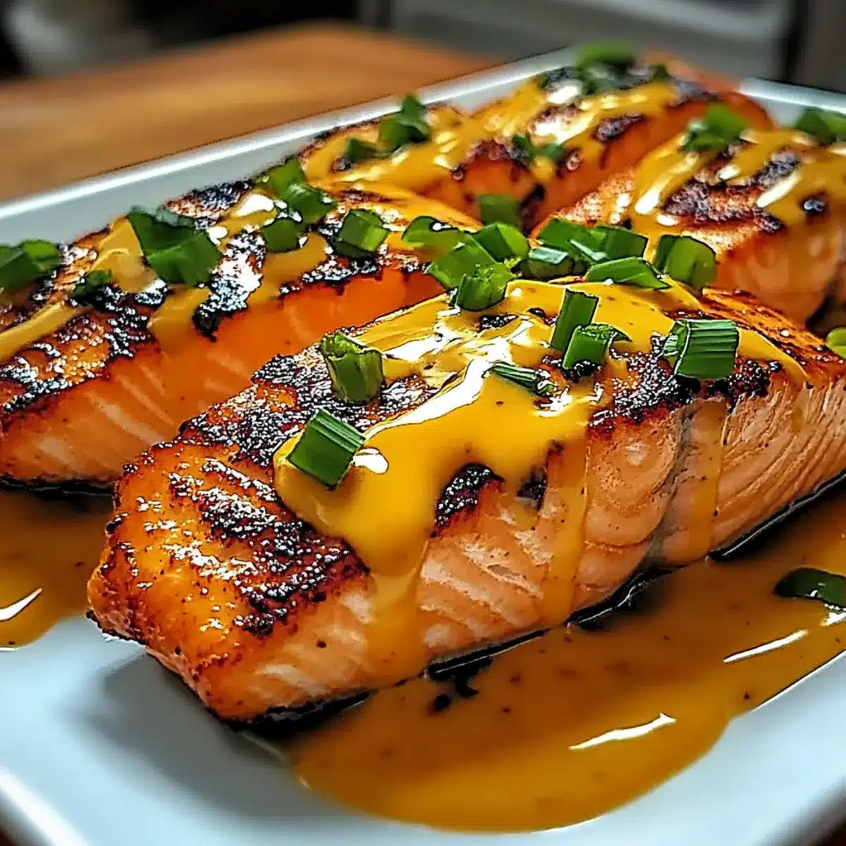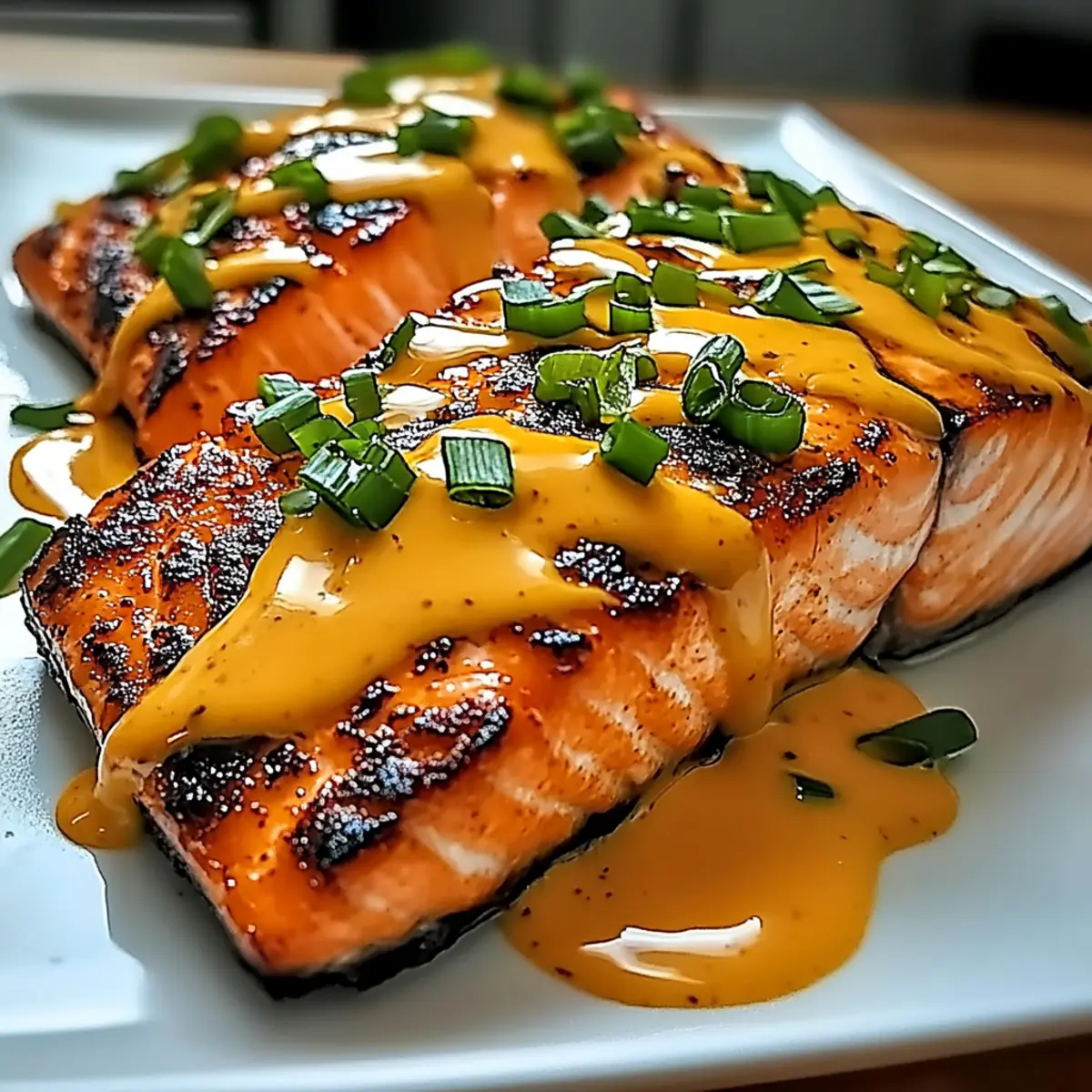 - Transfer cooked salmon to a plate, drizzle sauce, and garnish with green onions.