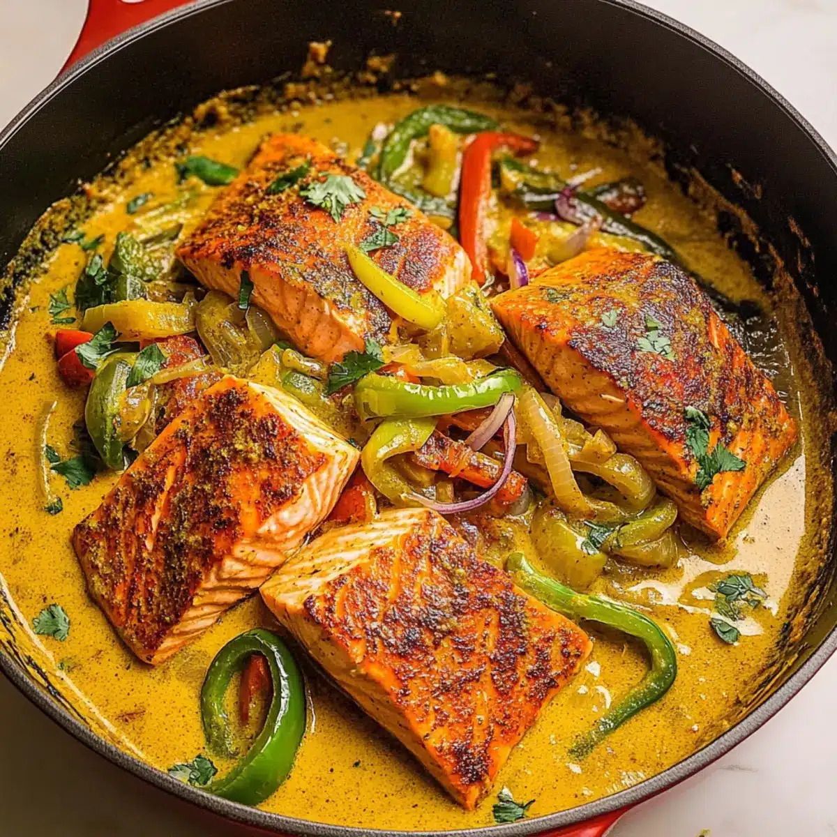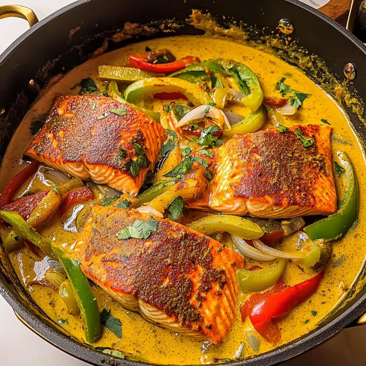 Carefully return the seared salmon fillets to the skillet, spooning the rich coconut curry sauce over the top. Let it simmer for an additional 1-2 minutes, allowing the salmon to absorb the flavors. Ensure the salmon reaches a perfectly flaky texture while the sauce envelops it in delicious creaminess.