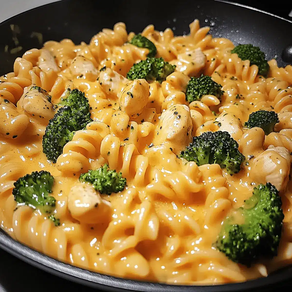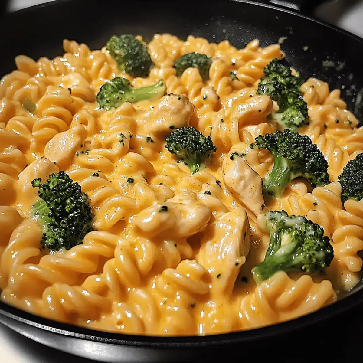 Now it’s time to incorporate the cooked rotini pasta into the skillet. Gently fold the pasta into the sauce, along with half of the shredded cheddar cheese. Stir continuously until the cheese is fully melted and combined, creating a creamy sauce that envelops the pasta, chicken, and broccoli.