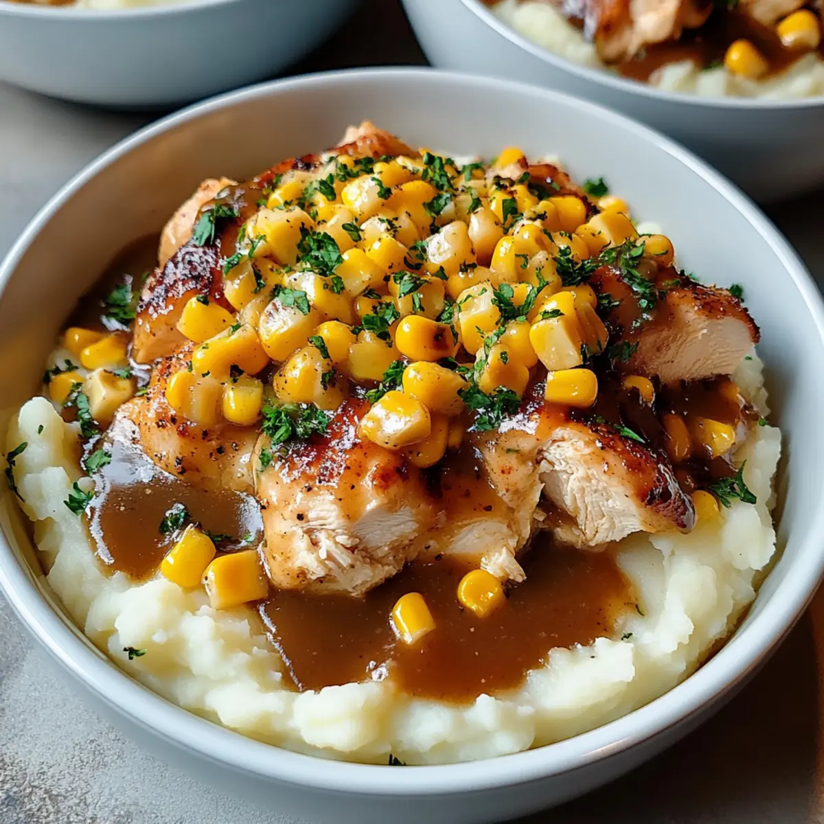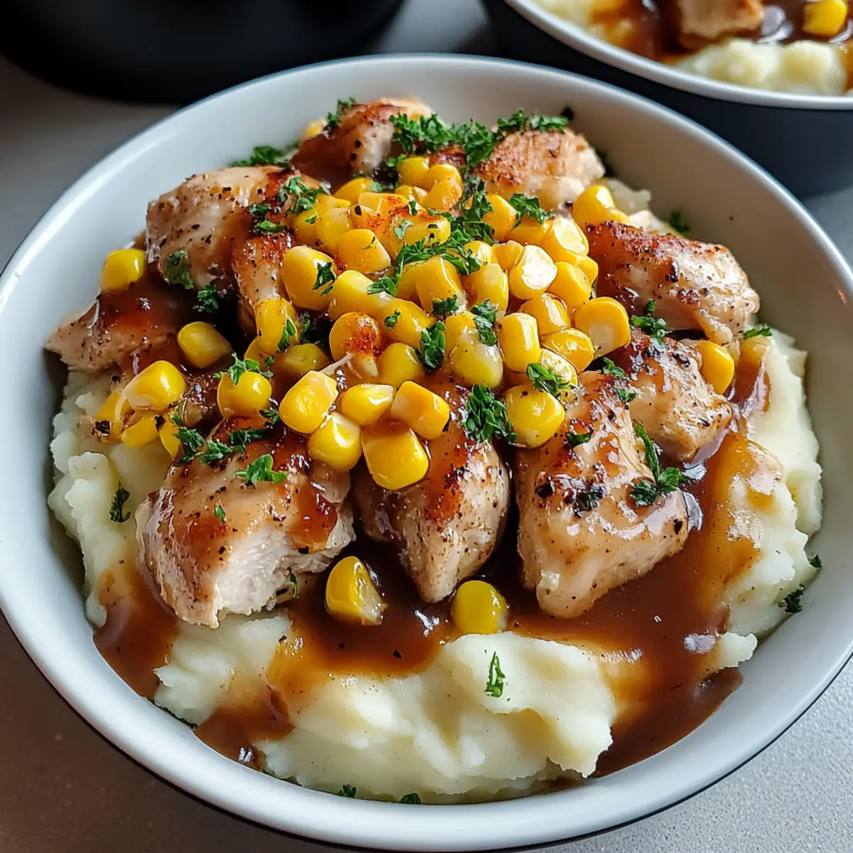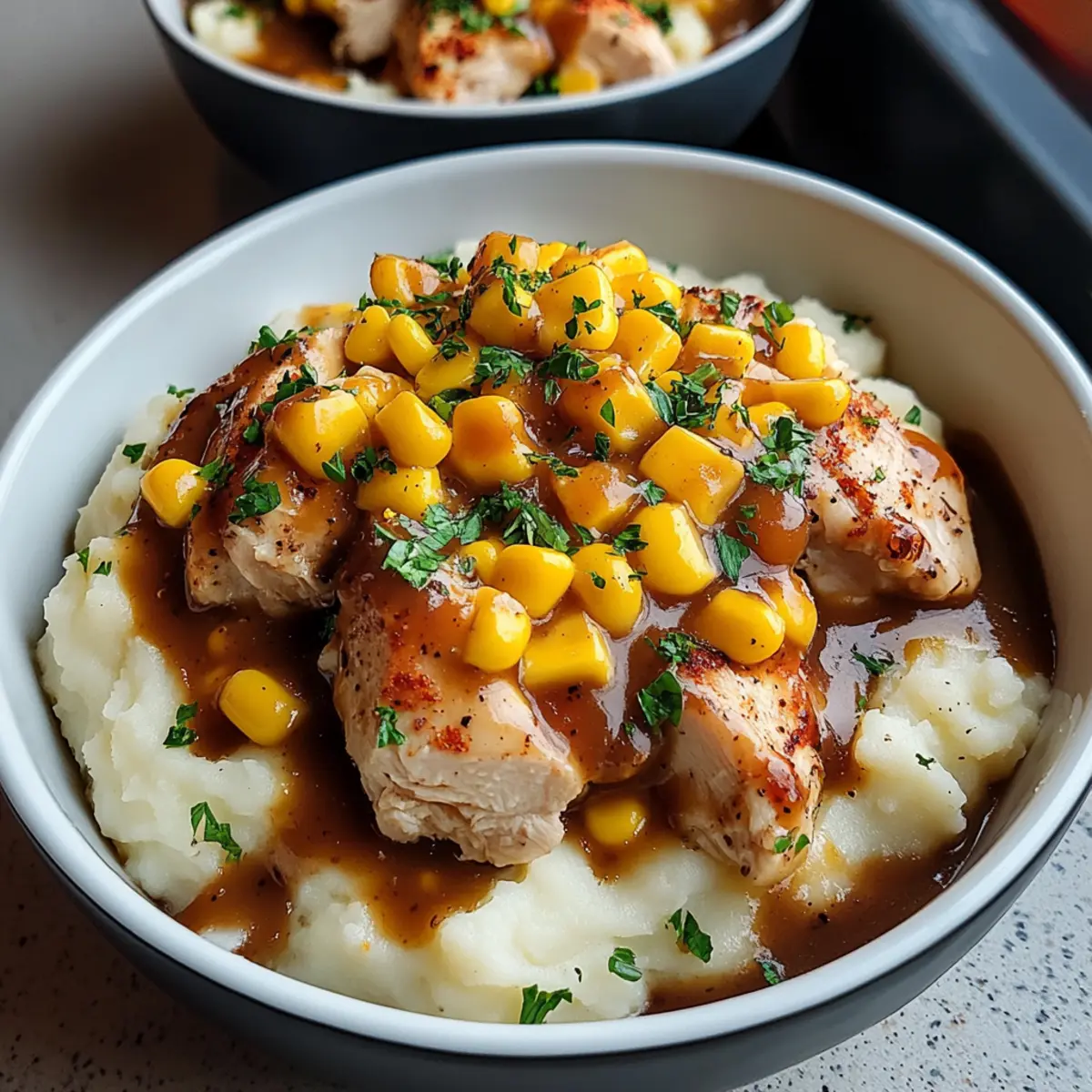 Gently spoon the prepared corn over the mashed potatoes, followed by arranging the golden chicken pieces atop the corn. This layering not only enhances the presentation but also brings beautiful textures and flavors, making your Chicken Mashed Potato Bowls visually appealing and delicious.