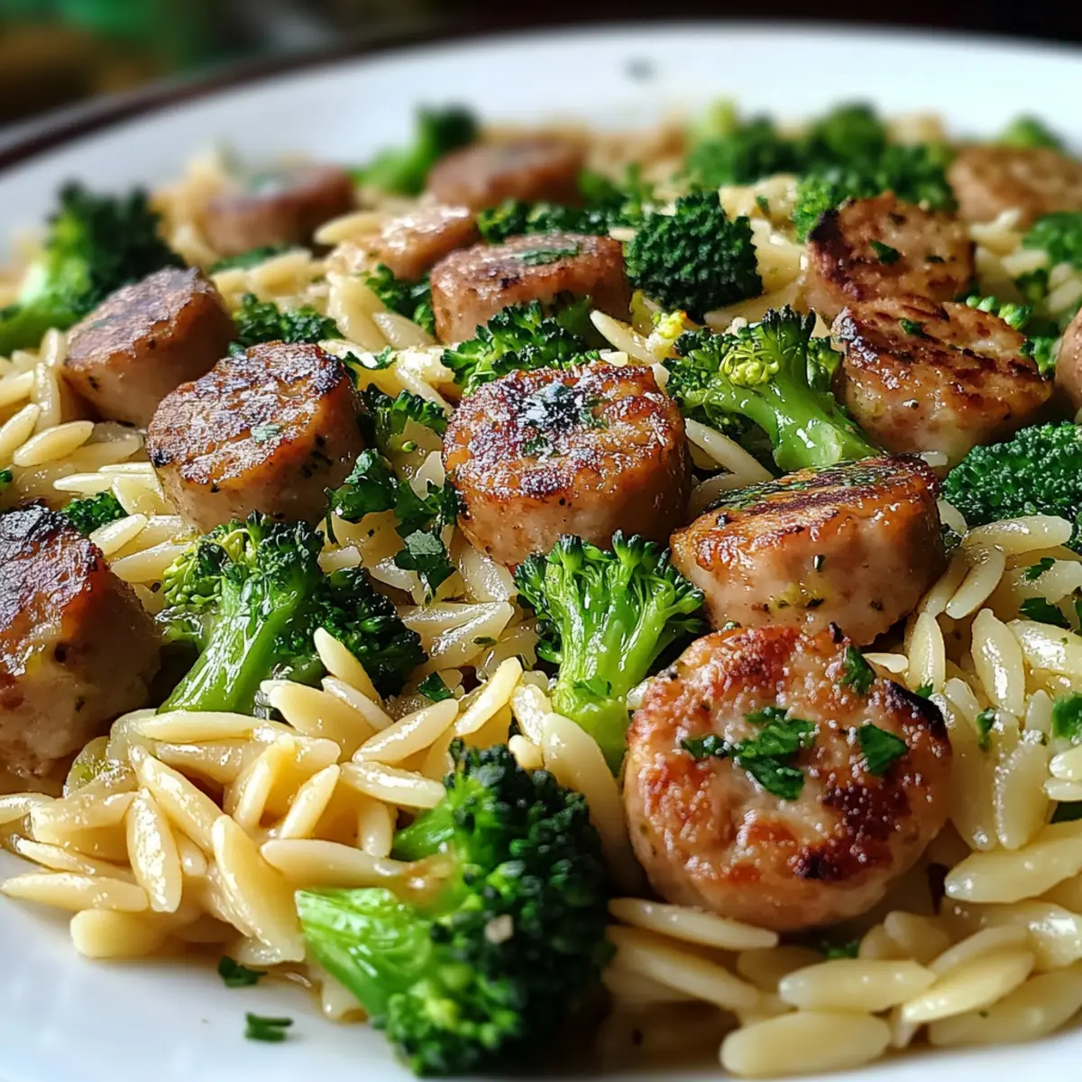 Remove from heat and spoon your Chicken Sausage Broccoli Orzo Meal onto plates. Garnish generously with chopped fresh parsley for a colorful touch. Enjoy your hearty, homemade meal that brings warmth and satisfaction to your dinner table.