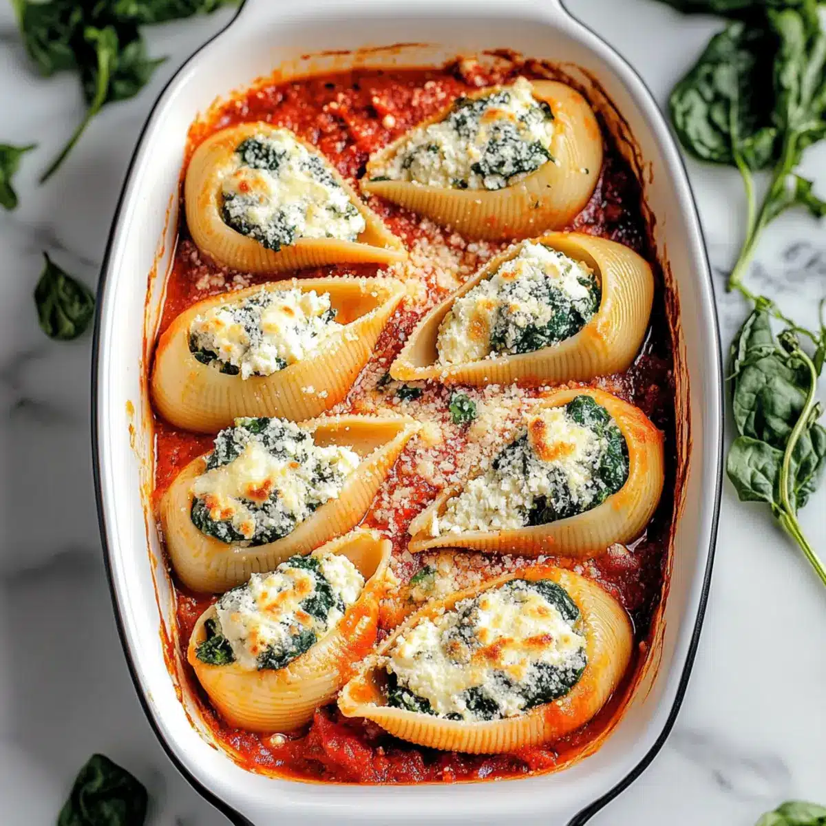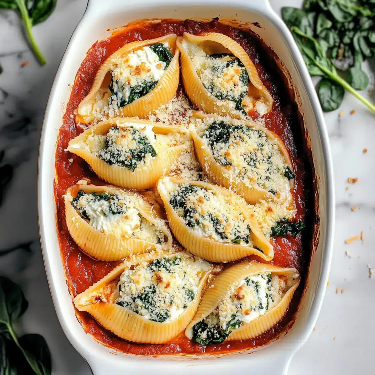 Spread a thin layer of marinara sauce evenly across the bottom of a 9×13 baking dish. Take each cooked pasta shell and generously stuff it with the spinach and cheese filling, placing them in a single layer over the marinara. This step is where the dish starts to take shape, showcasing the colorful filling.