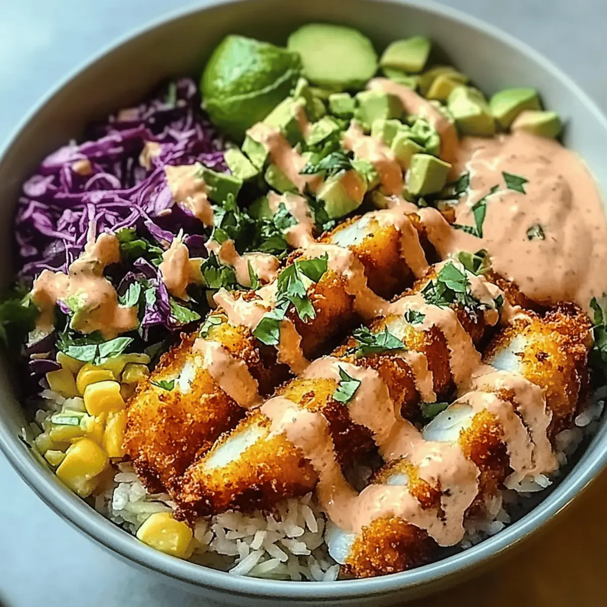 Cilantro Lime Rice: Light and zesty, this rice contrasts beautifully with the crispy fish and enhances the overall flavor profile of the bowls.