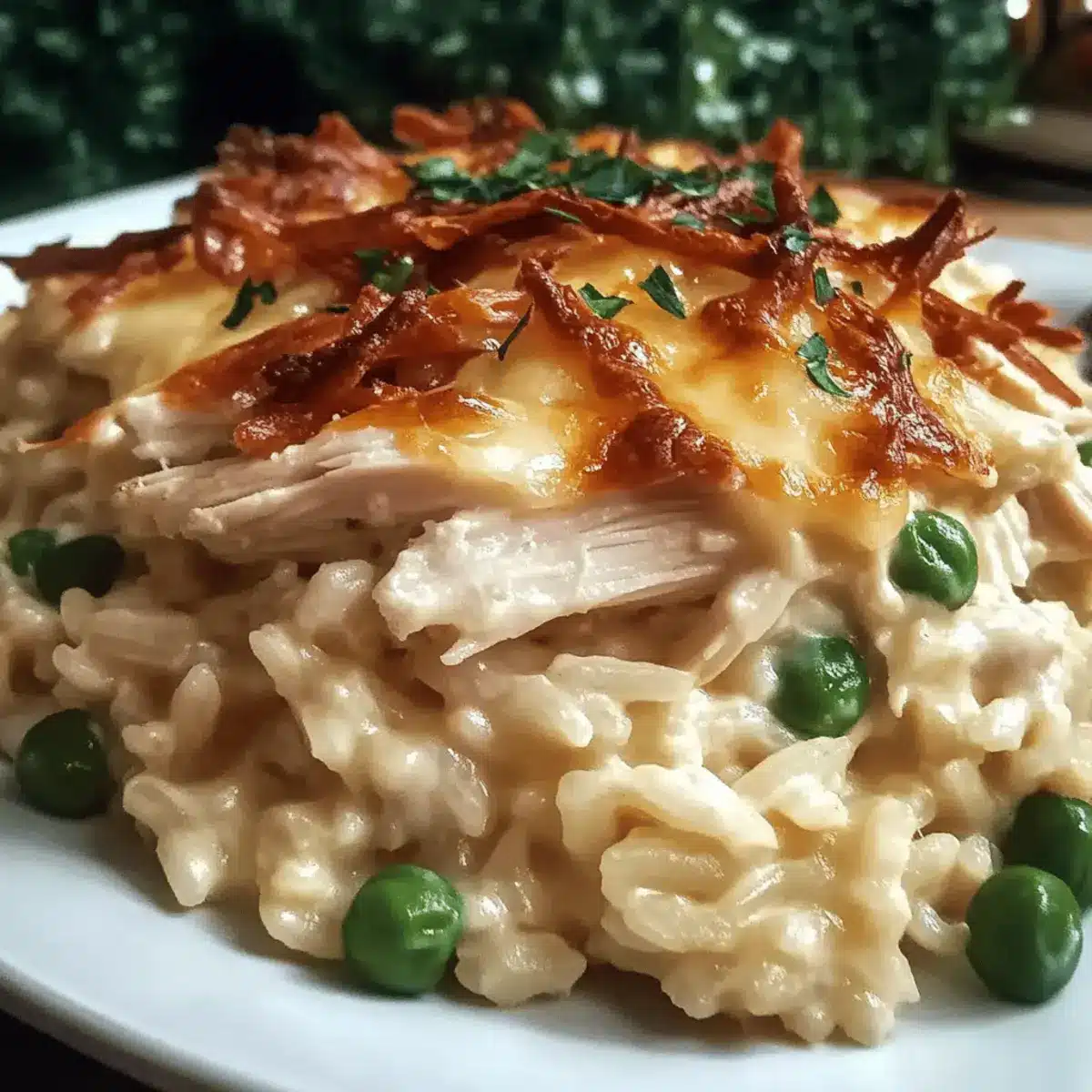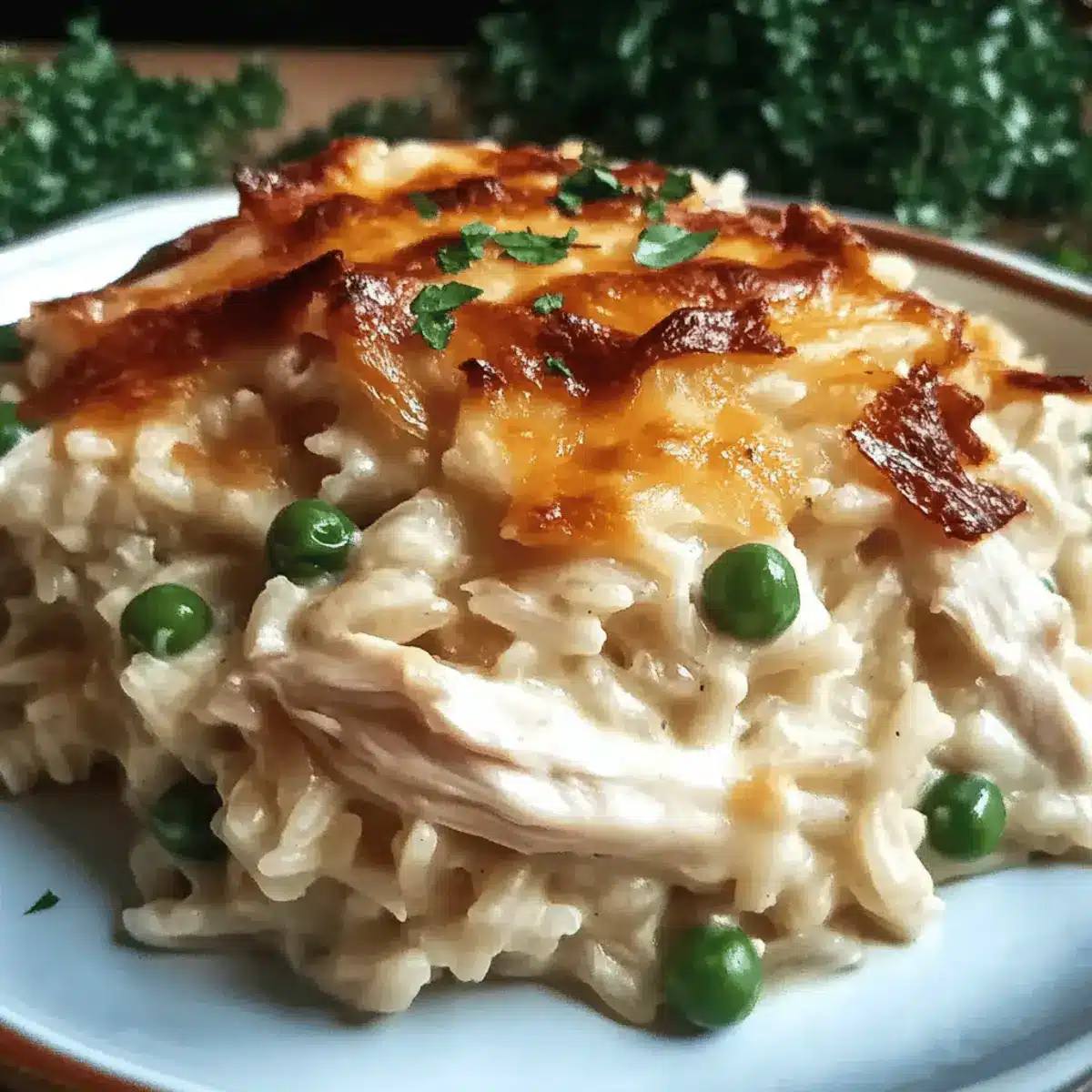 Once the cheese is melted and bubbly, remove the casserole from the oven. For an extra touch of freshness, garnish with chopped fresh parsley. This aromatic finish brings a lovely burst of color and flavor, making your Dump-and-Bake Chicken Alfredo Rice Casserole ready to serve hot to your family.