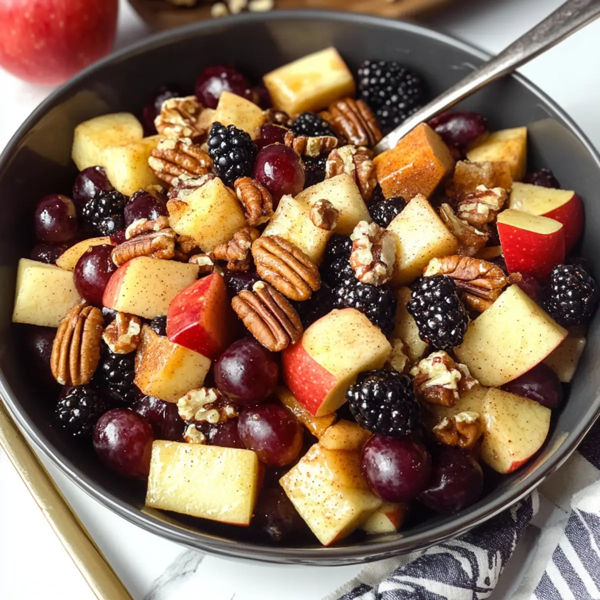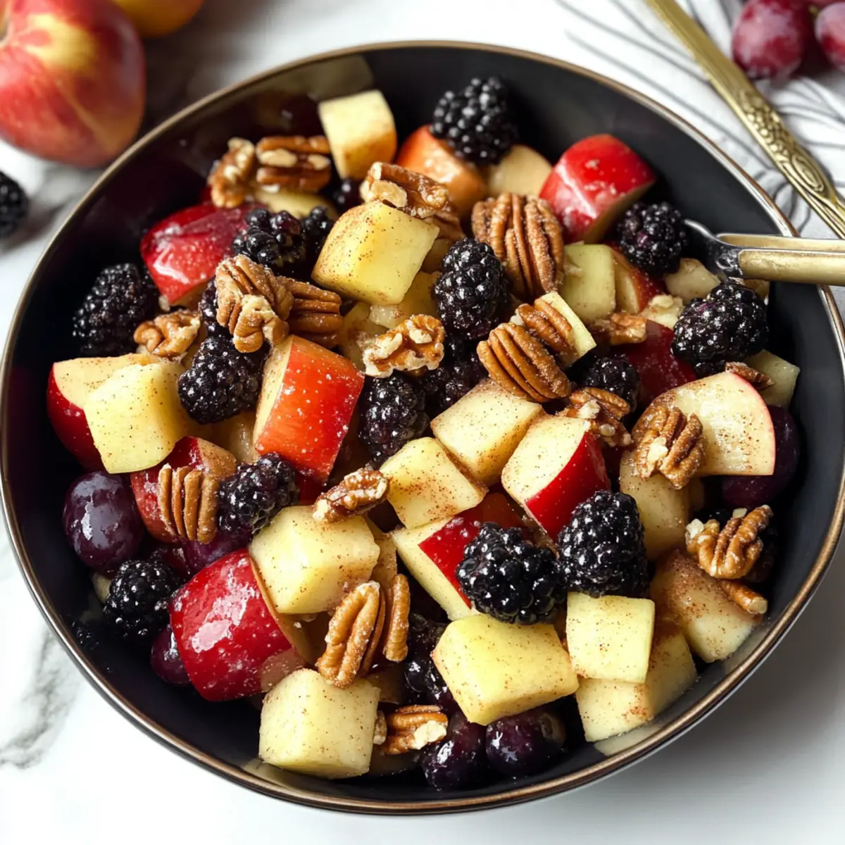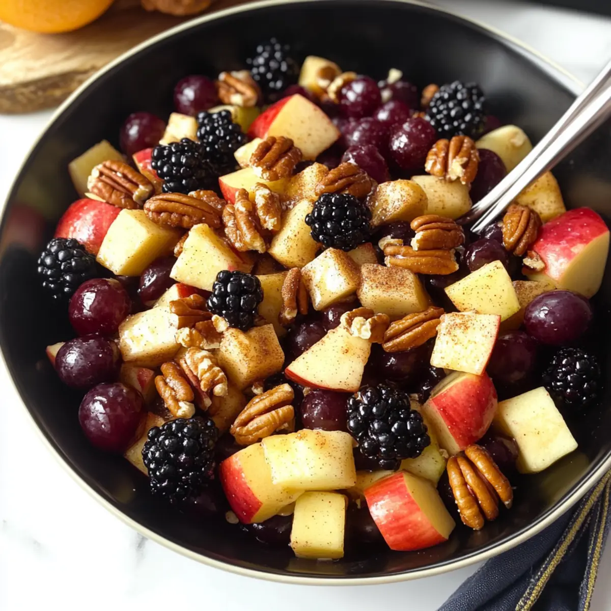 A delightful Fall Fruit Salad featuring a mix of apples, grapes, and blackberries, dressed with a cinnamon orange dressing.