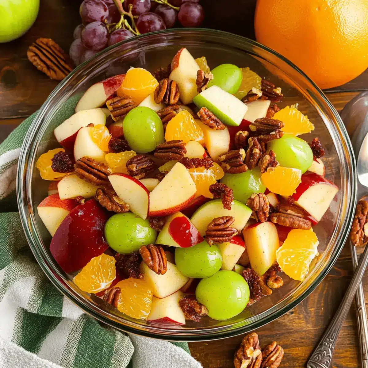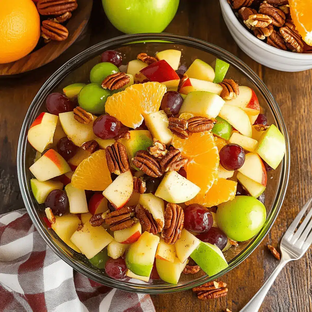 - Step 5: In a large mixing bowl, combine the apple pieces, dried cranberries, cooled pecans, grapes, and orange segments. Gently toss together.