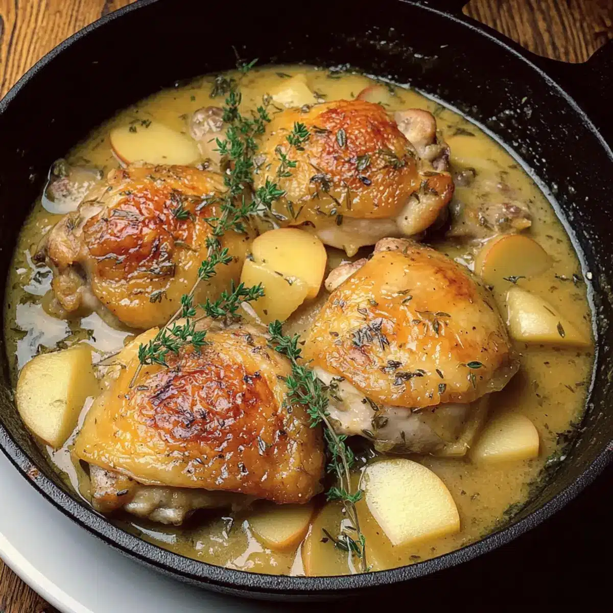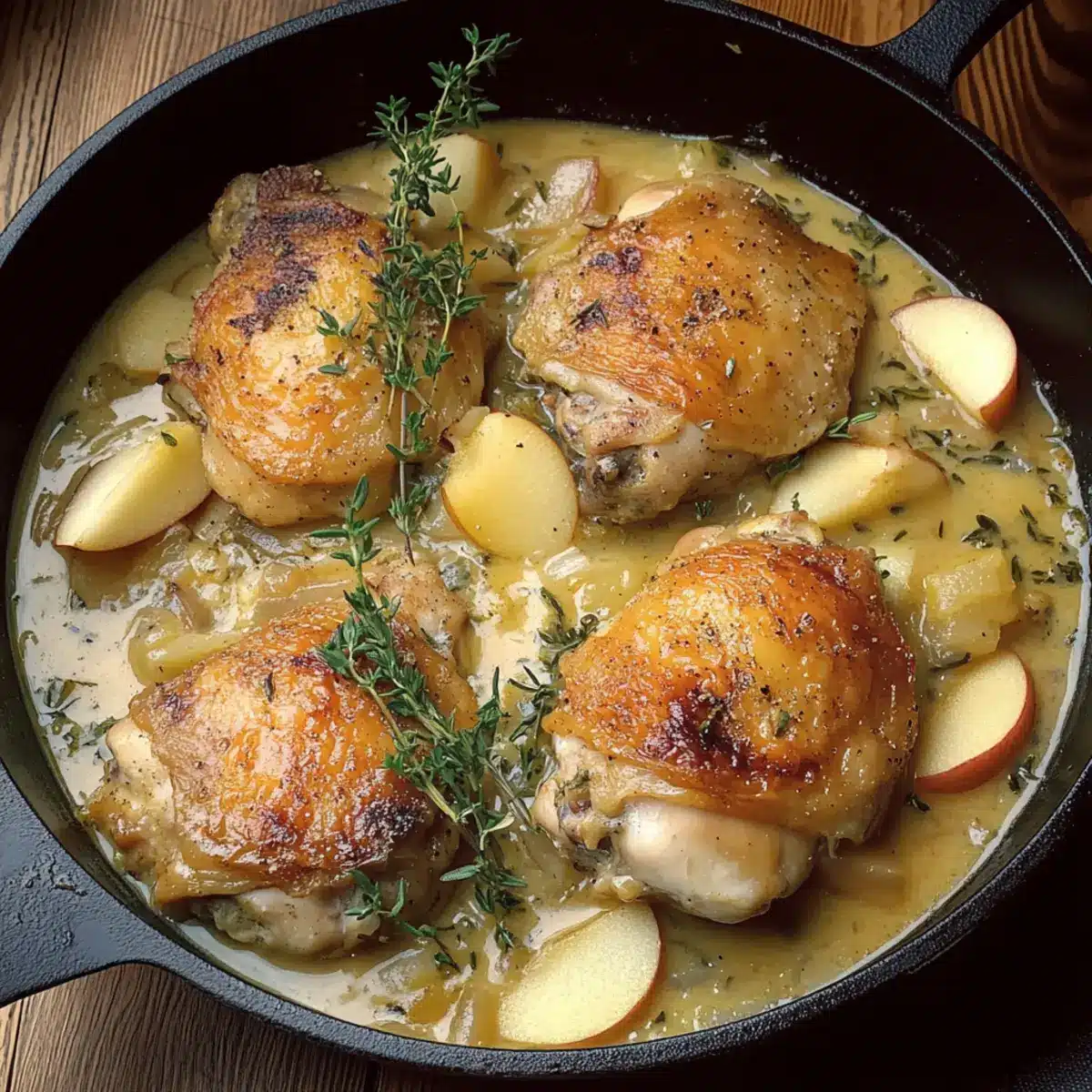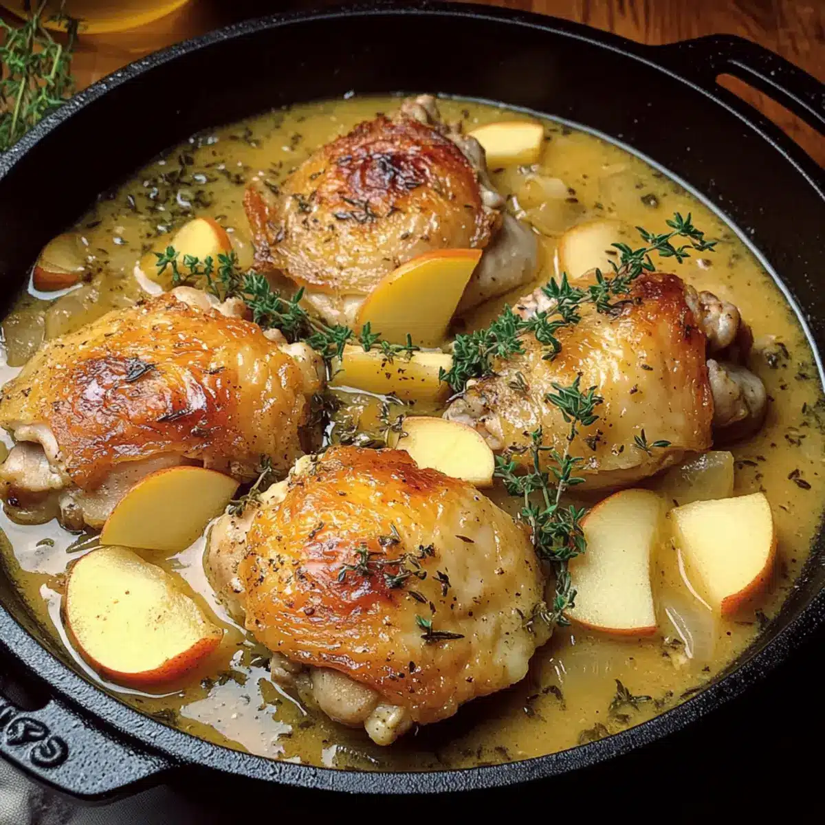 Finally, return the chicken to the pan, allowing it to warm in the thickened sauce for a couple of minutes. Garnish your French Apple Cider Chicken with fresh thyme and parsley before serving, and enjoy this comforting dish alongside crusty bread or creamy mashed potatoes for a complete meal.