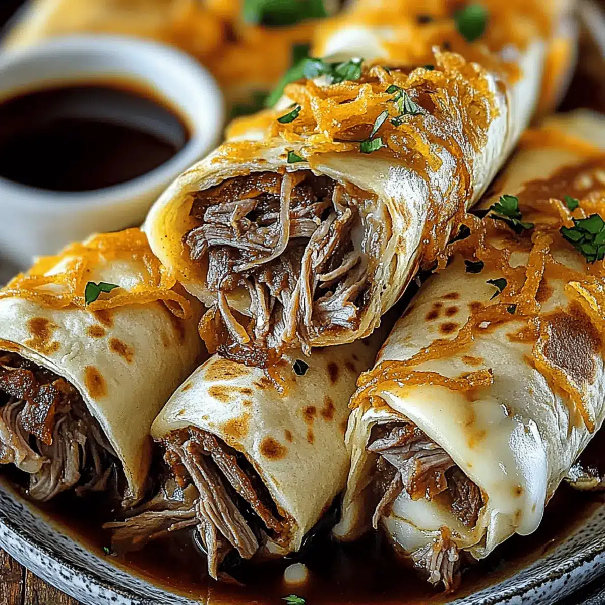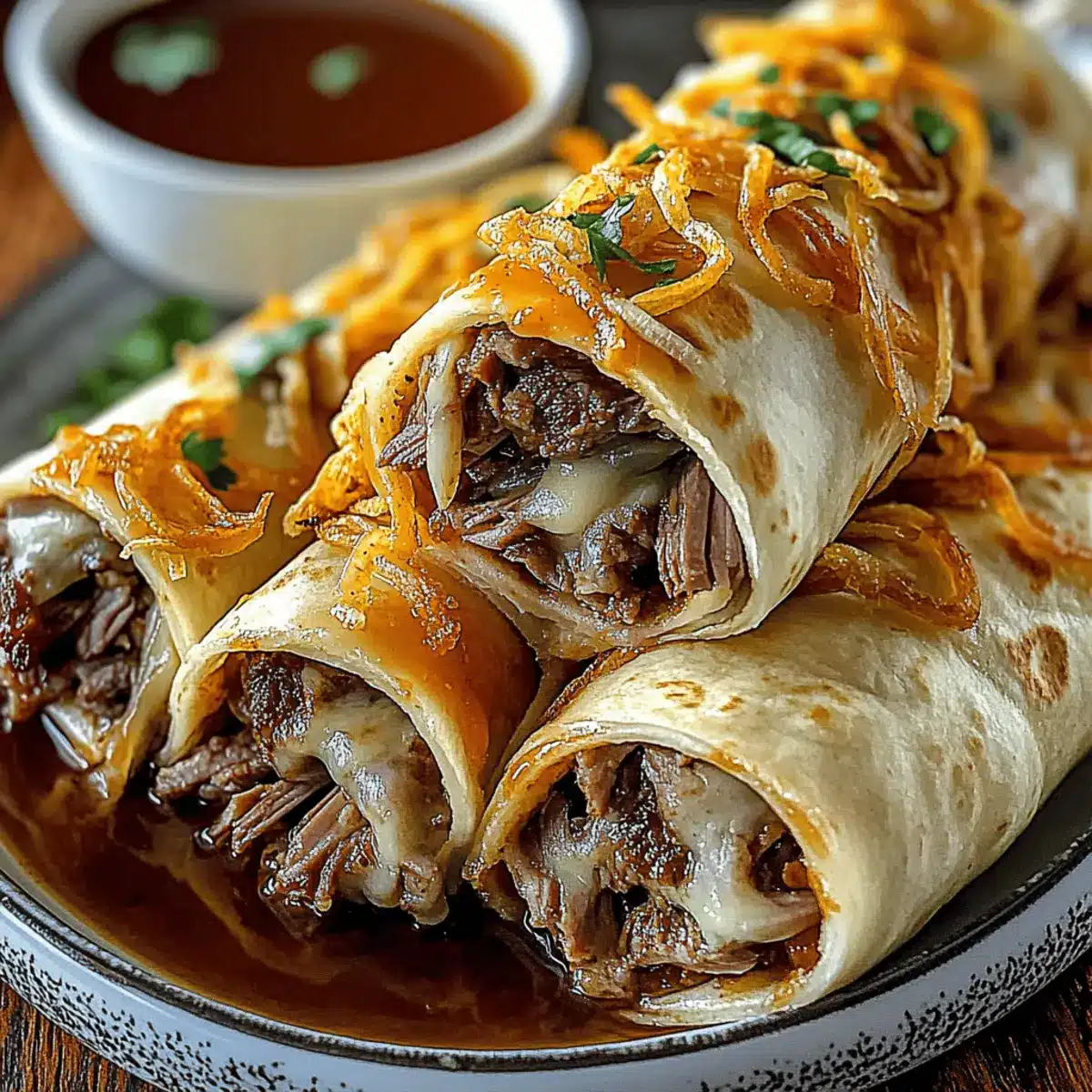 As I stood in the kitchen, the tantalizing aroma of savory beef and melted cheese filled the air, instantly reminding me of cozy family gatherings. These French Dip Tortilla Roll Ups are a delightful twist on the beloved classic, transforming the hearty flavors of a French dip sandwich into a fun, handheld treat. Quick to whip up and perfect for game day or a busy weeknight dinner, this recipe is not only a crowd-pleaser but also a foolproof way to impress your friends and family. With crispy tortillas hugging tender roast beef and provolone cheese, accompanied by a warm, rich au jus for dipping, you’ll find yourself craving these delicious roll-ups again and again. Are you ready to indulge in this easy yet satisfying meal?