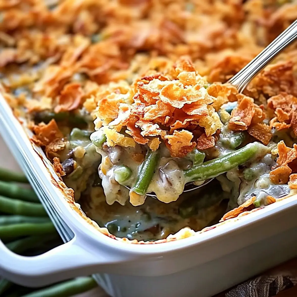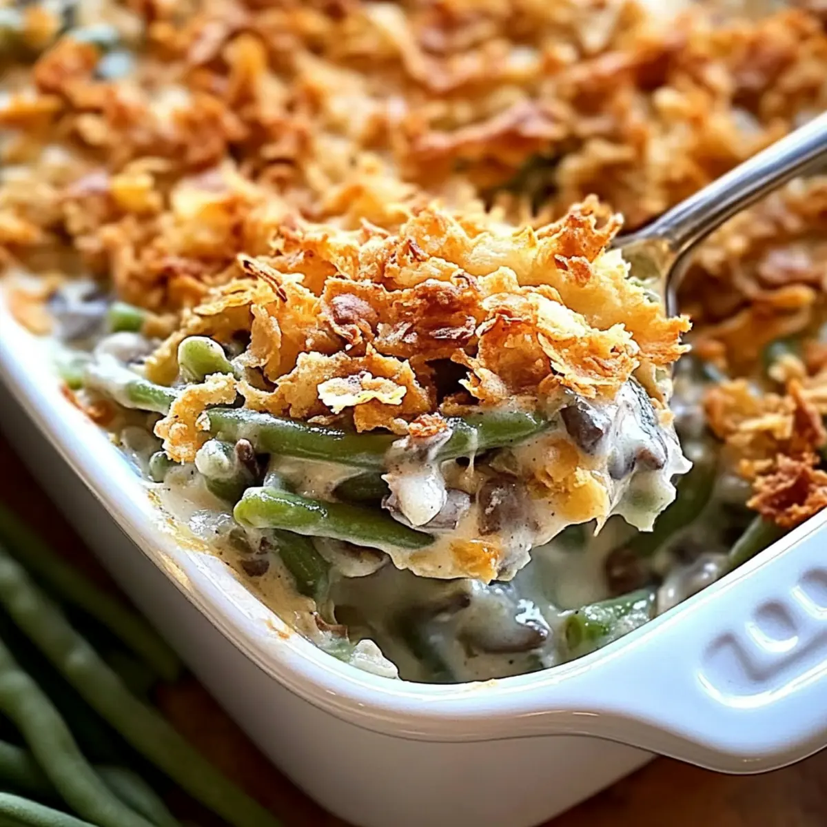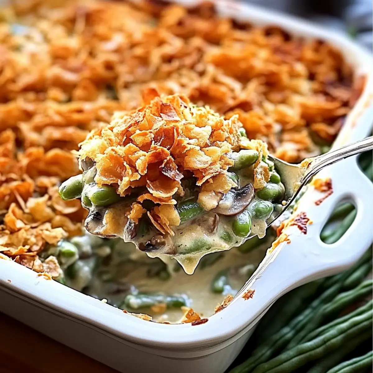 Once baked to perfection, remove the casserole from the oven and allow it to cool for a few minutes. This brief resting period will allow the flavors to settle, making it easier to serve. Dive into this cozy and creamy Green Bean Casserole, perfect for any gathering!