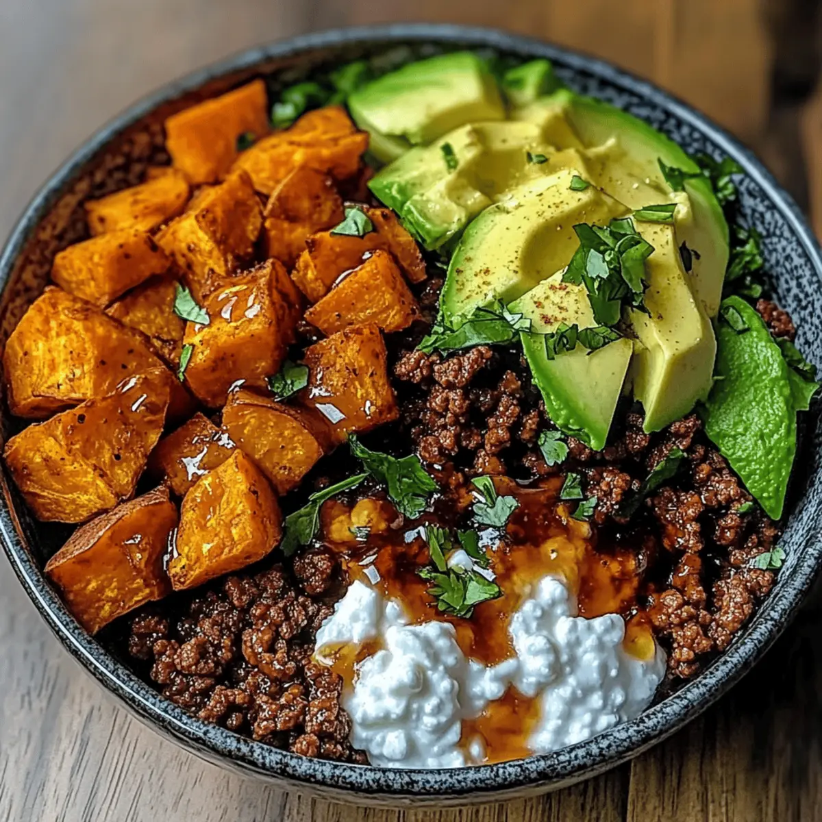 - Assemble the bowls with sweet potatoes first, then ground beef, avocado, and cottage cheese.