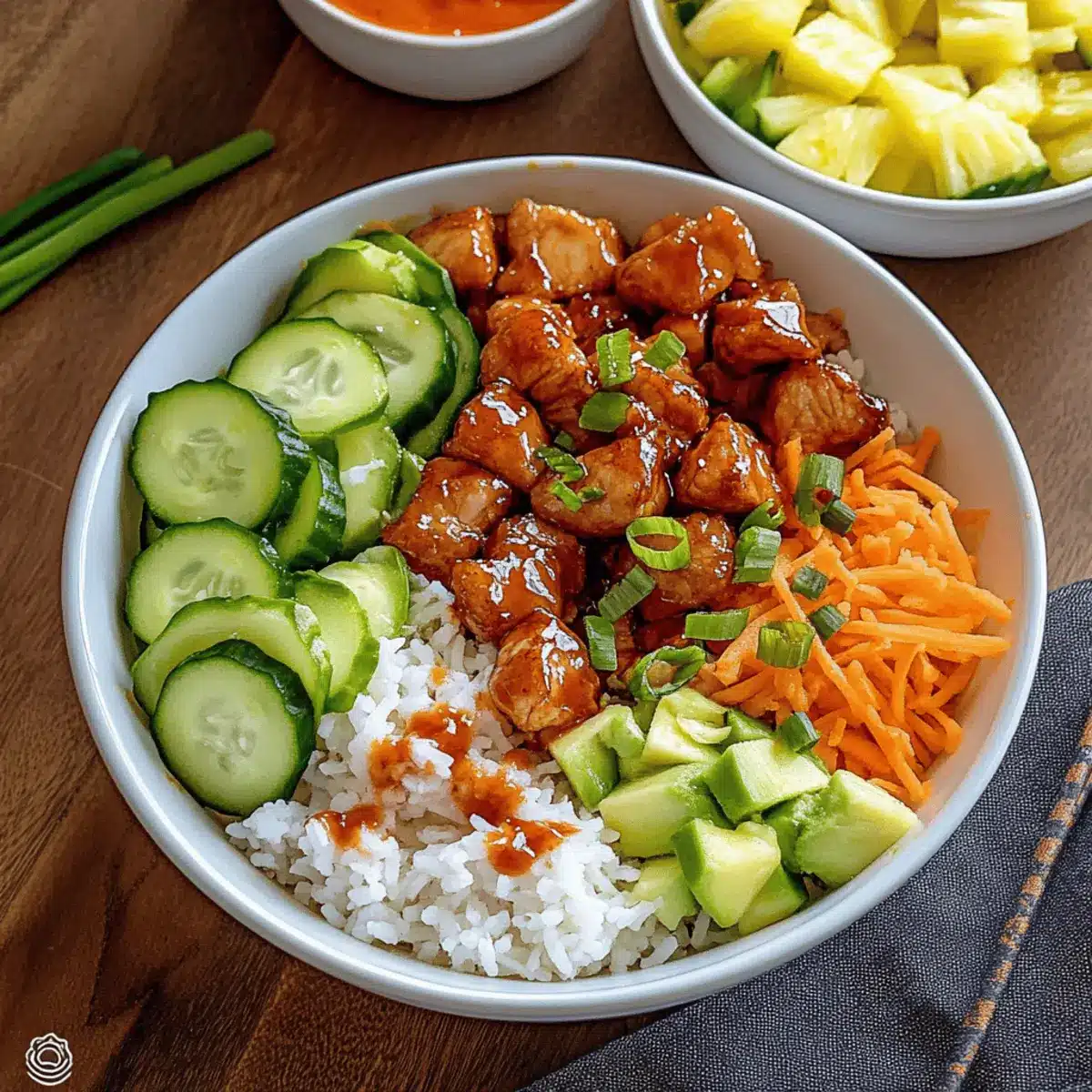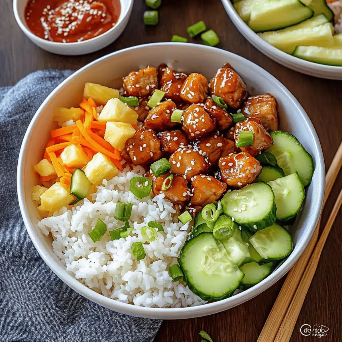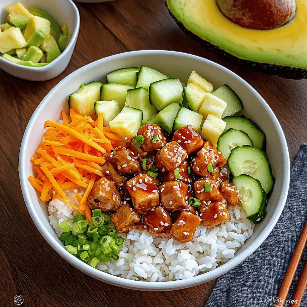 Start by spooning a generous portion of cooked Jasmine or sushi rice into a bowl, creating a soft base. Gently layer the tangy chicken on top, followed by a colorful arrangement of cucumber, pineapple, avocado, red onion, julienned carrot, edamame, and spring onions. The vibrant colors and fresh ingredients will come together beautifully in your Hawaiian Inspired Chicken Poke Bowl.