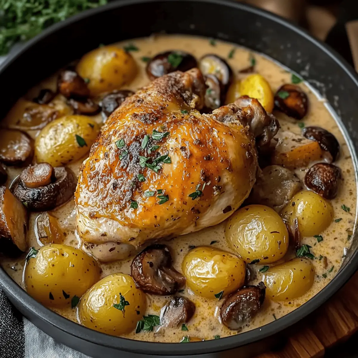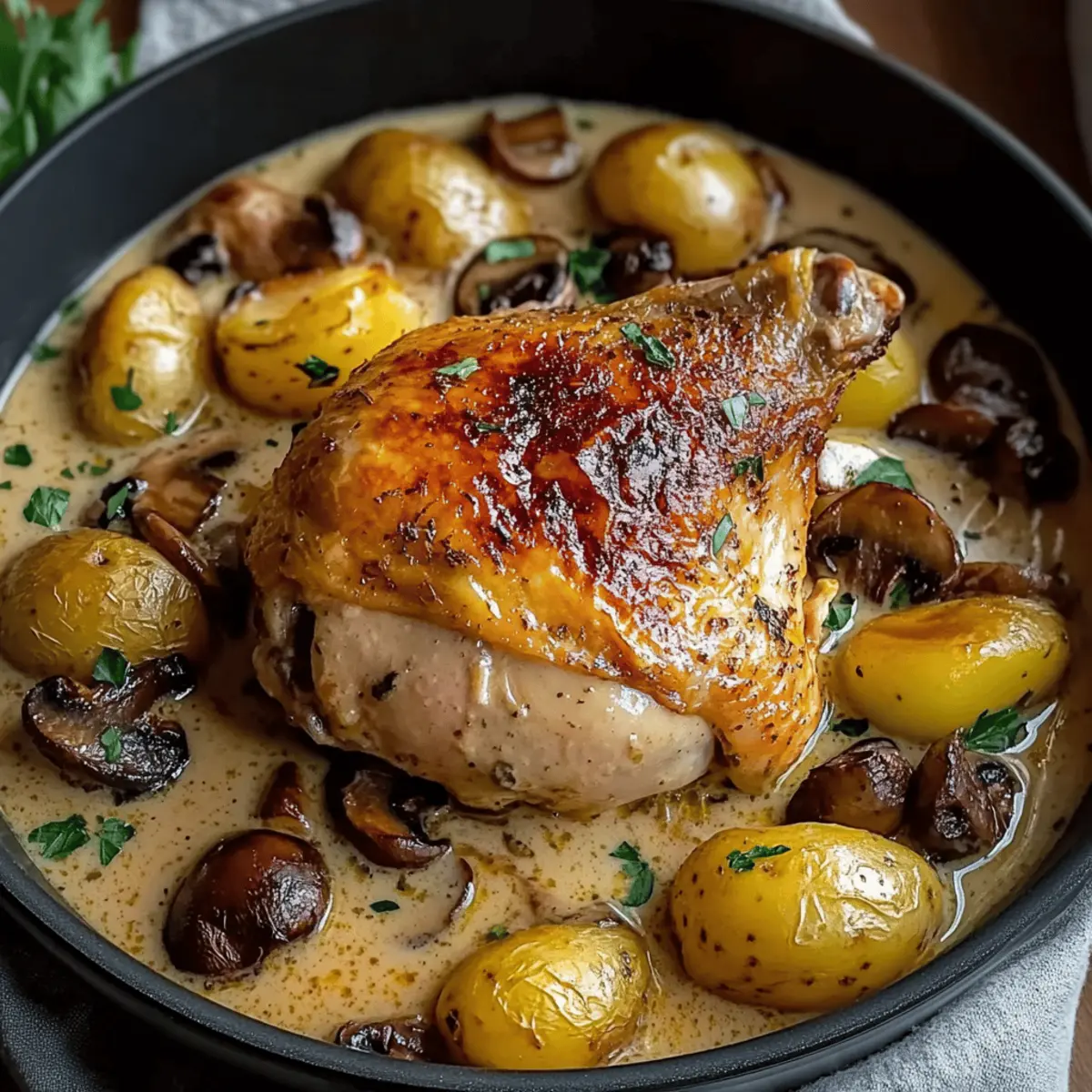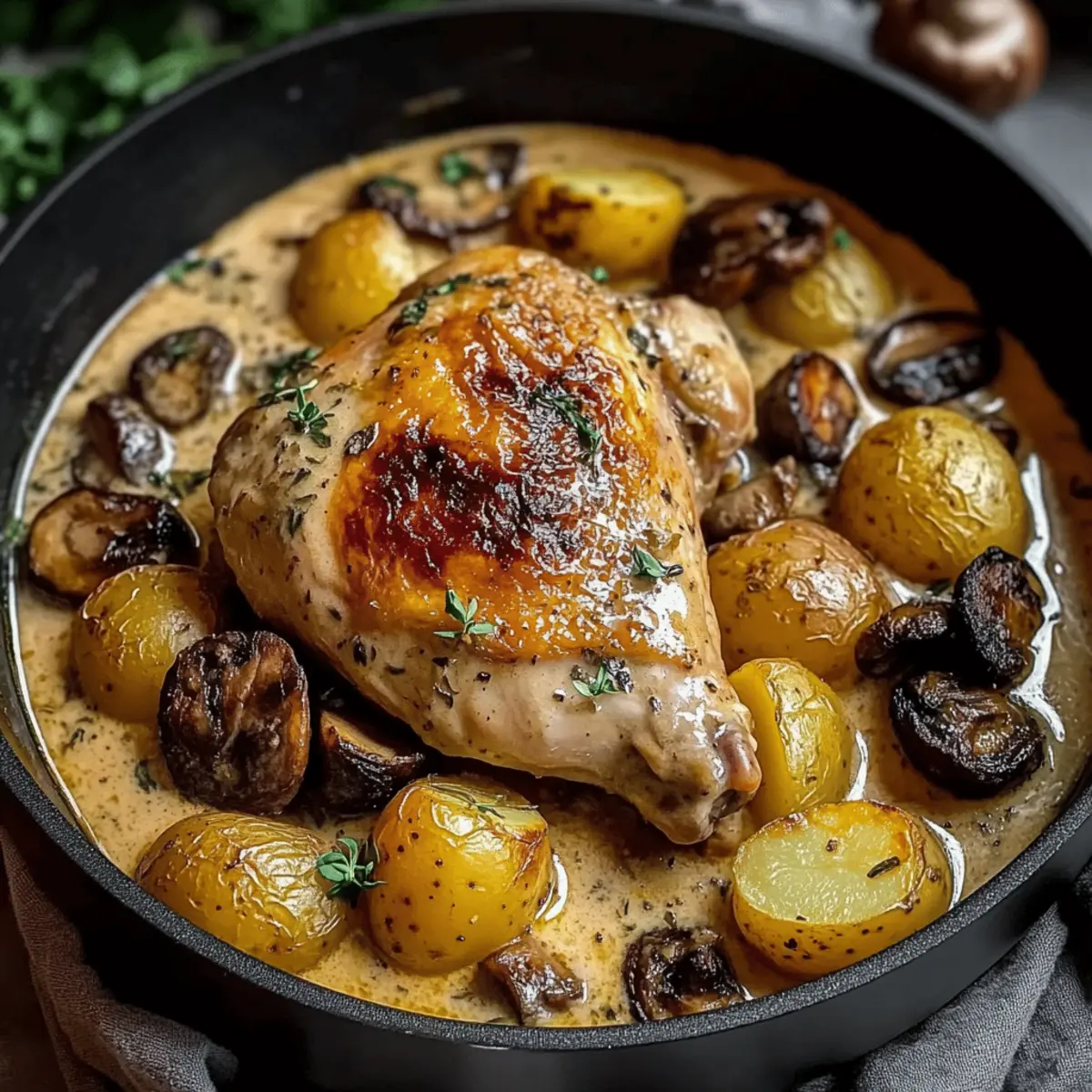 One-Pot Wonder: This Herb Roasted Chicken in Creamy White Sauce with Mushroom and Potatoes simplifies meal prep. You’ll love how everything cooks together, cutting down on cleanup time while delivering restaurant-quality taste!