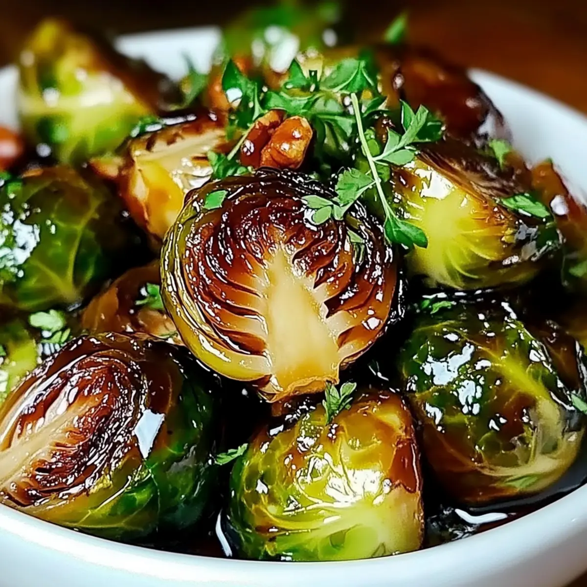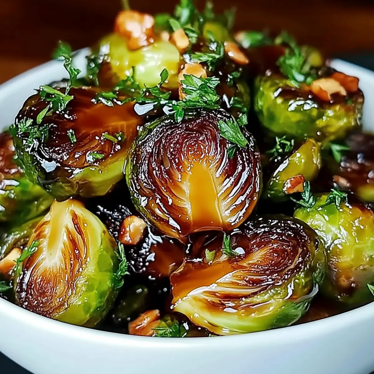 - Once the Brussels sprouts are perfectly roasted, transfer them to a large serving bowl. Drizzle the honey balsamic glaze evenly over the sprouts, tossing gently to coat every piece thoroughly. If desired, garnish with chopped pecans or walnuts and fresh parsley for a vibrant presentation. Serve immediately.
