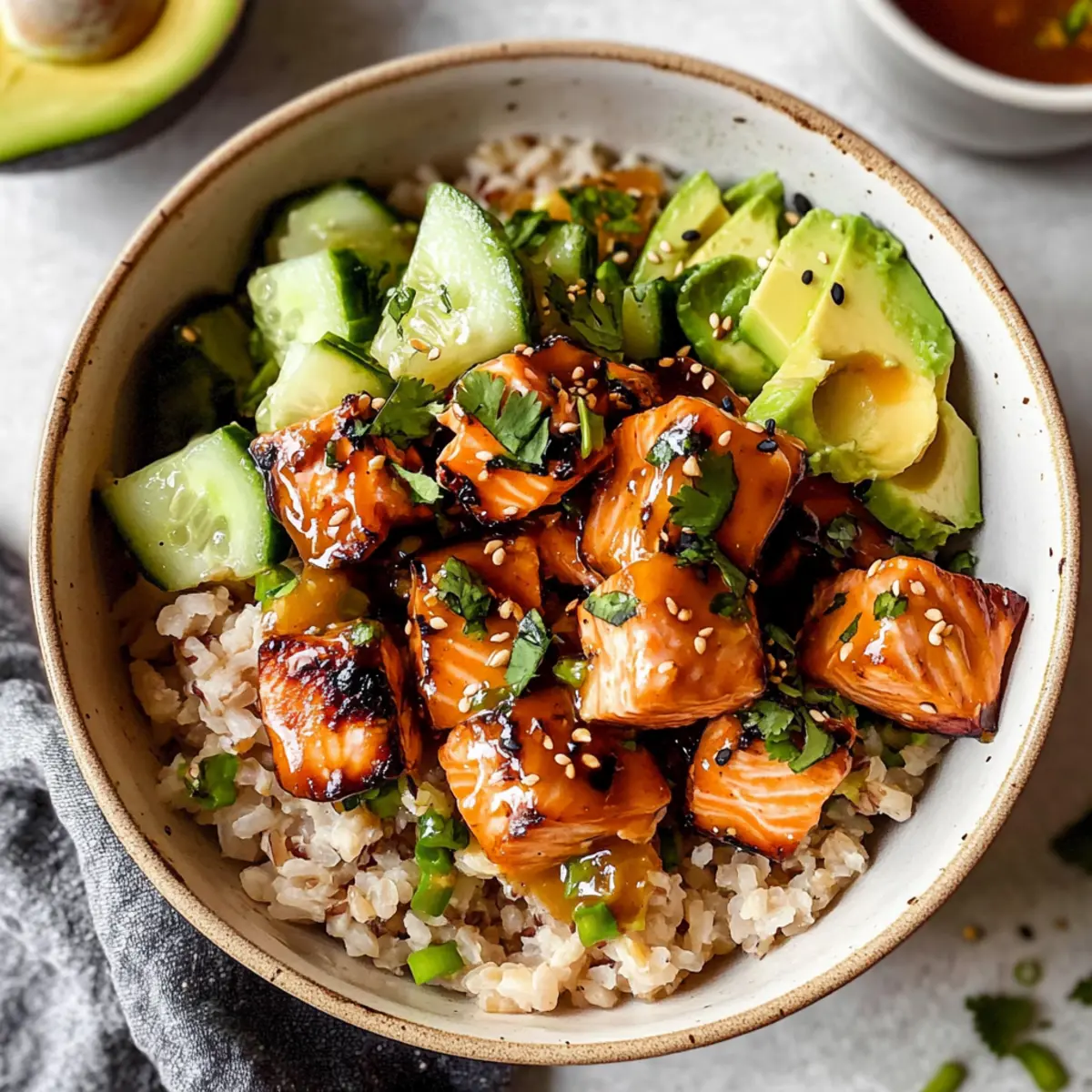 Avoid Soggy Rice: Make sure your brown rice is fully cooked and fluffy; excess water can lead to a soggy base for your Honey Glazed Salmon Bowl.