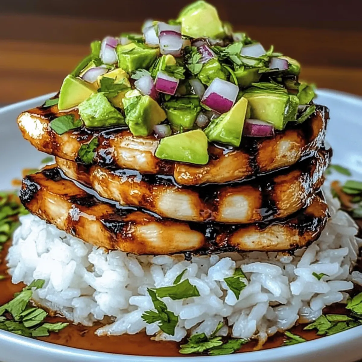 On a plate, start with a generous layer of the fluffy jasmine rice. Slice the grilled chicken and layer it on top of the rice, then spoon the vibrant avocado mixture over the chicken. Garnish your stack with fresh lime wedges, adding a zesty kick right before serving, and enjoy this delightful and nutritious dish!