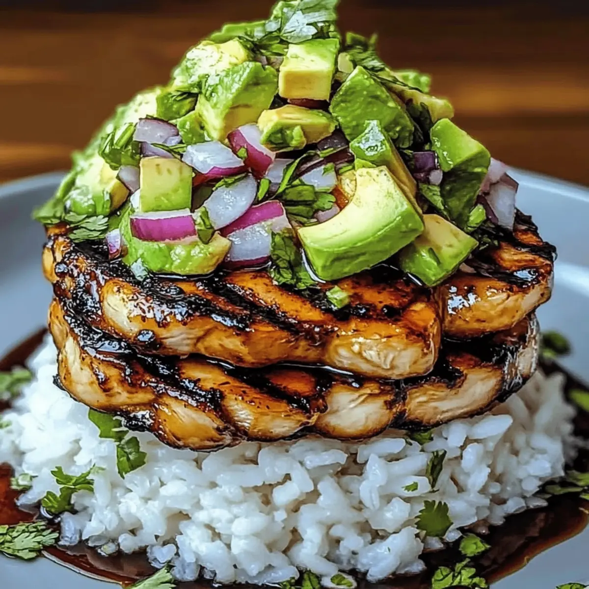 6. On a plate, start with a layer of jasmine rice, slice the grilled chicken and layer it on top, then spoon the avocado mixture over the chicken. Garnish with fresh lime wedges.