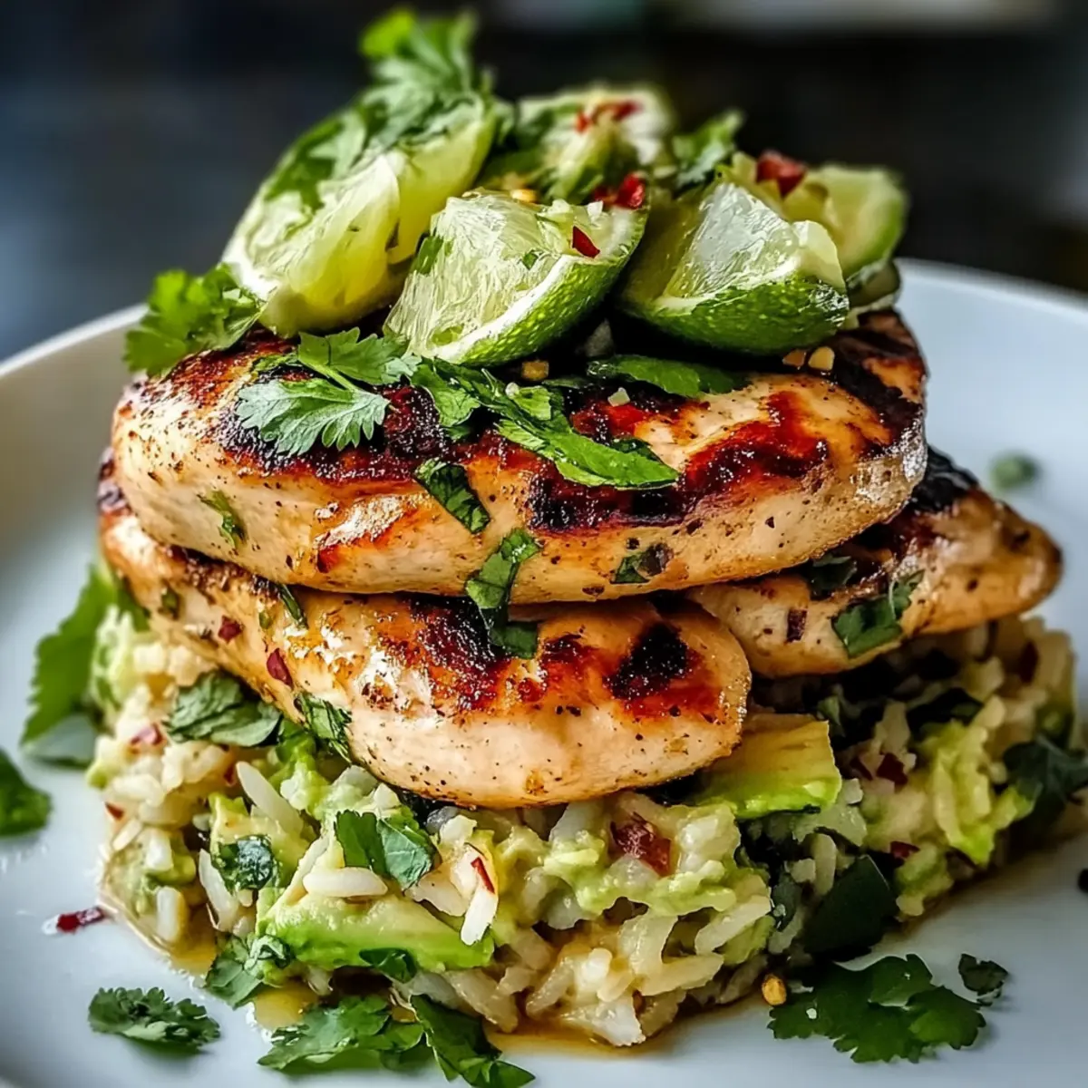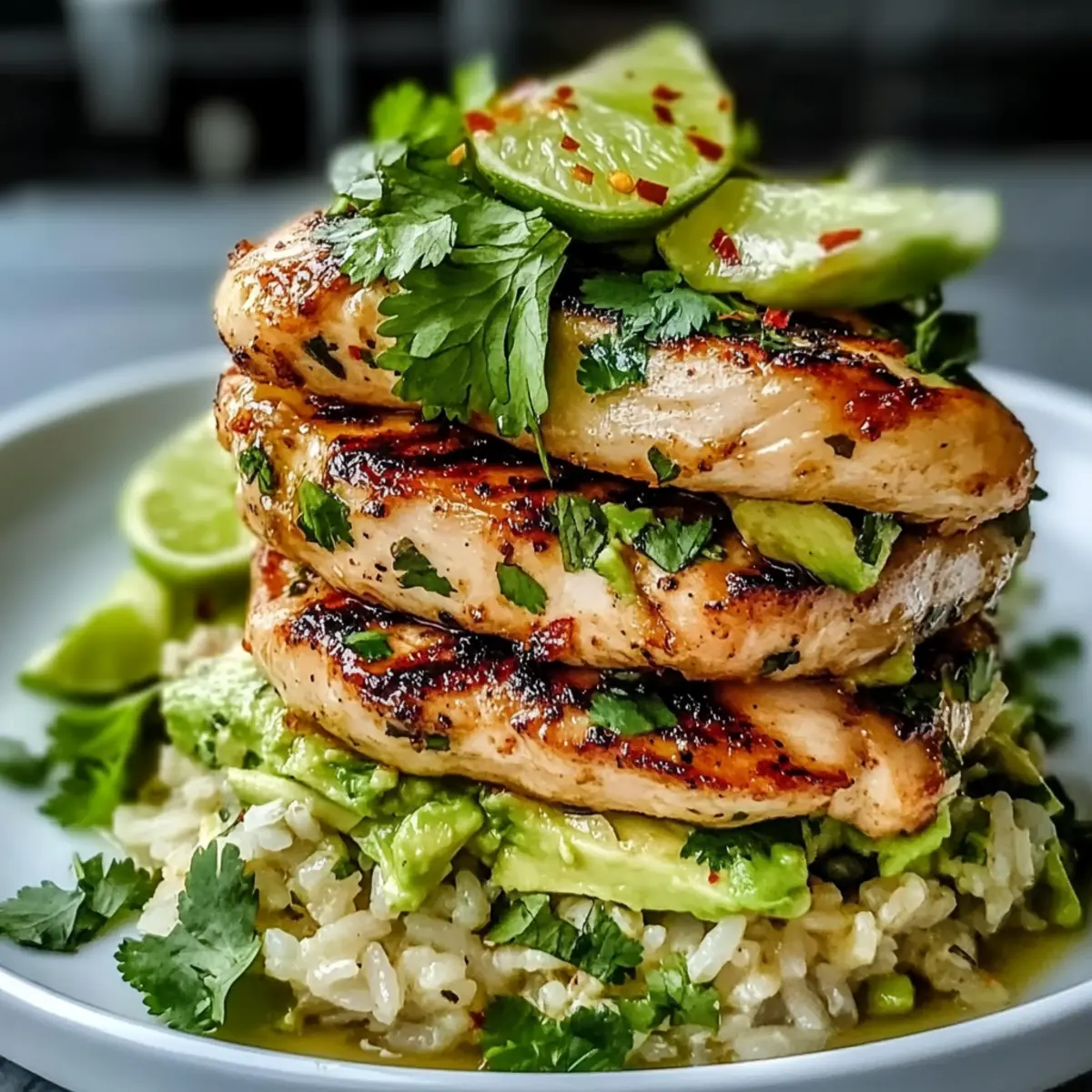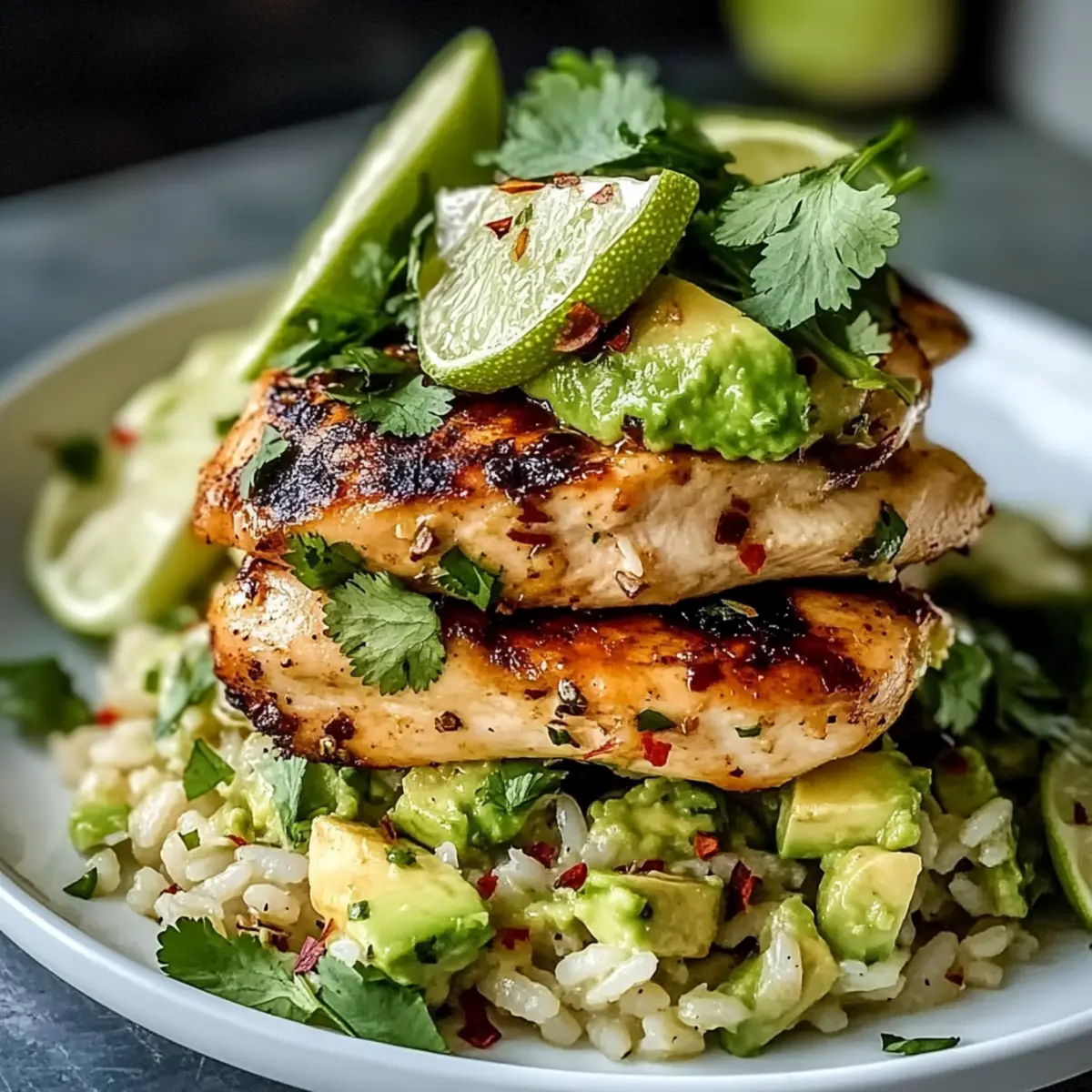 To create the honey lime chicken avocado stack, place a cooking ring mold on a serving plate. Layer the creamy avocado rice as the base, pressing it down gently. Slice the grilled chicken and layer it on top of the rice. Finish with a garnish of fresh cilantro or parsley, lime zest, a sprinkle of chili flakes for heat, and a handful of toasted sesame seeds for extra crunch.