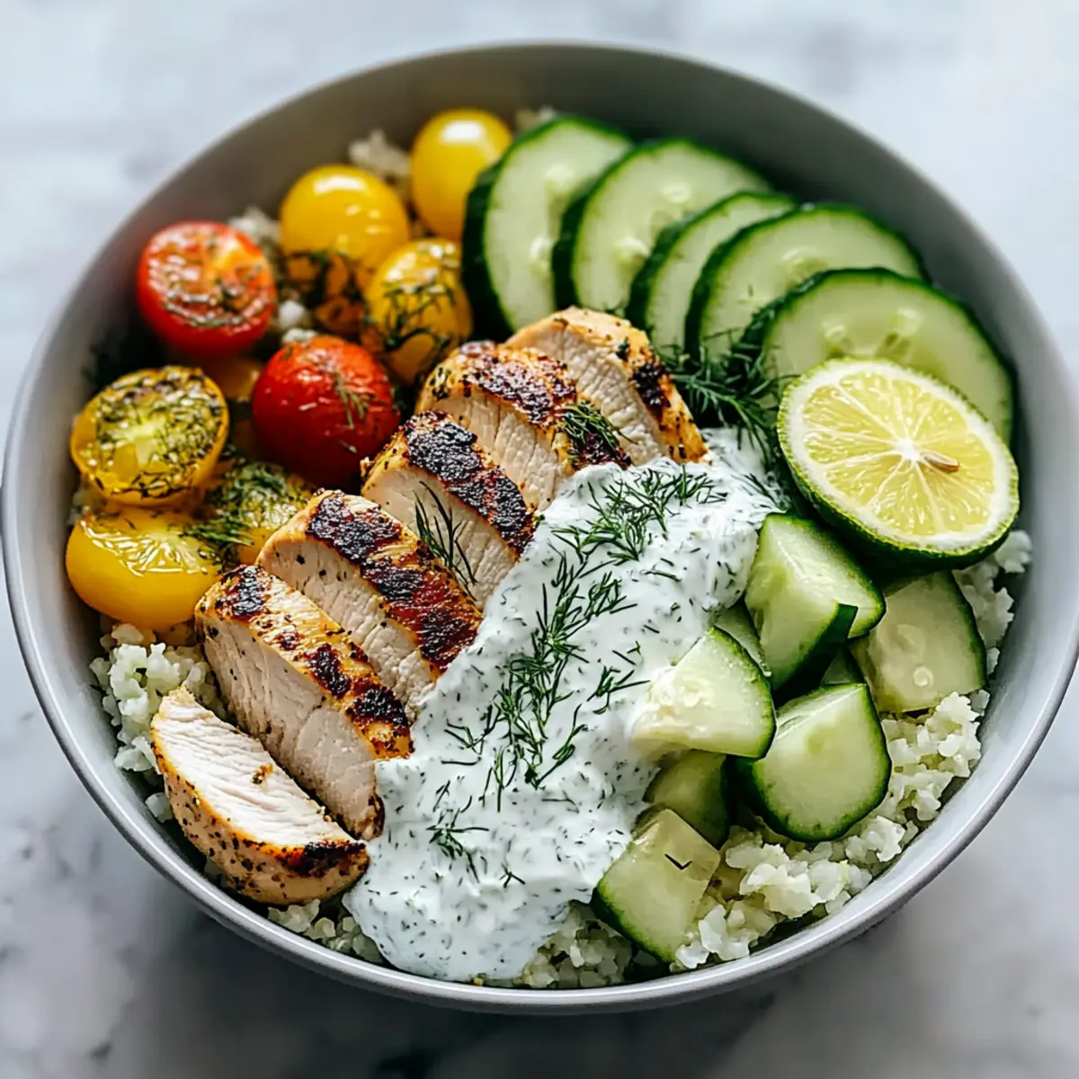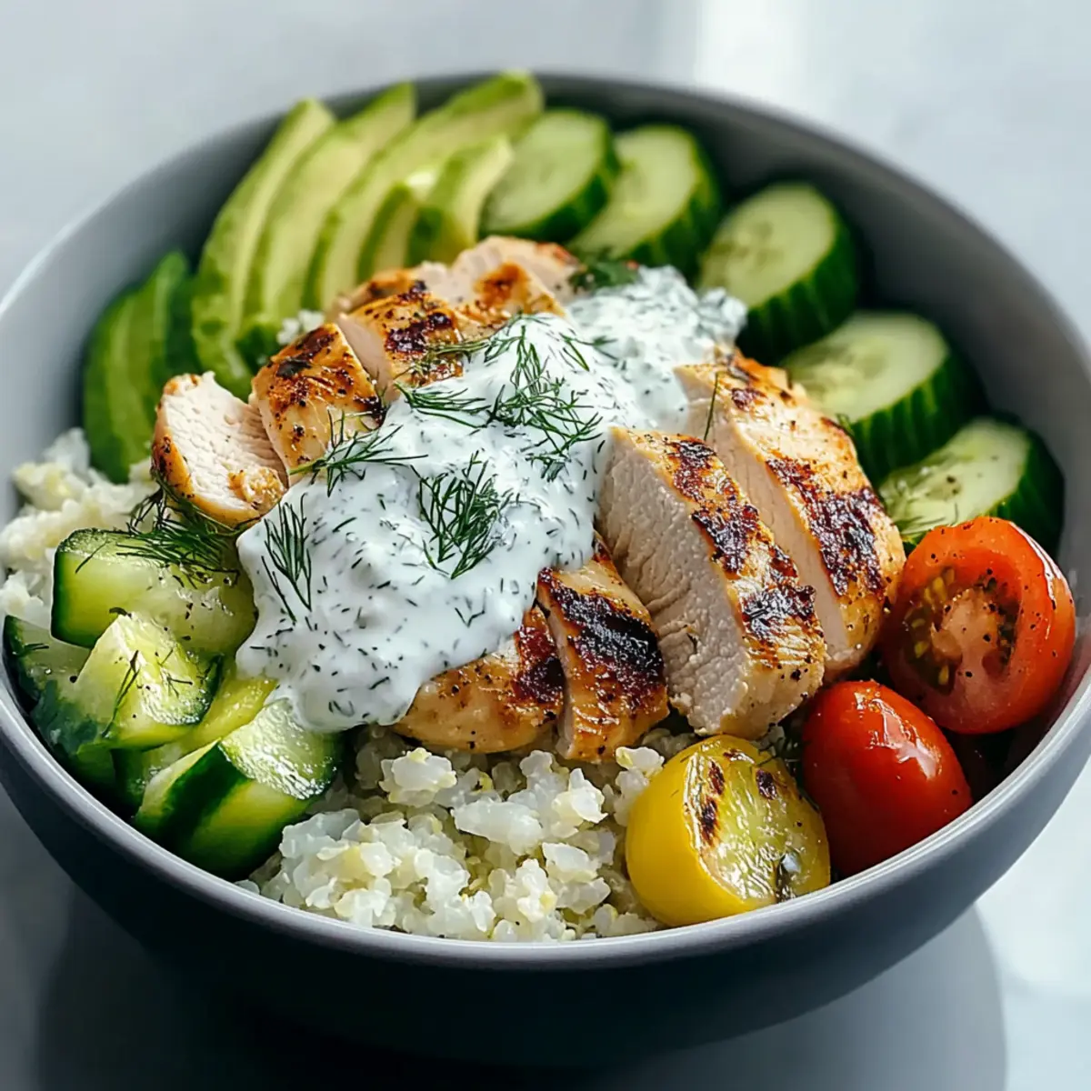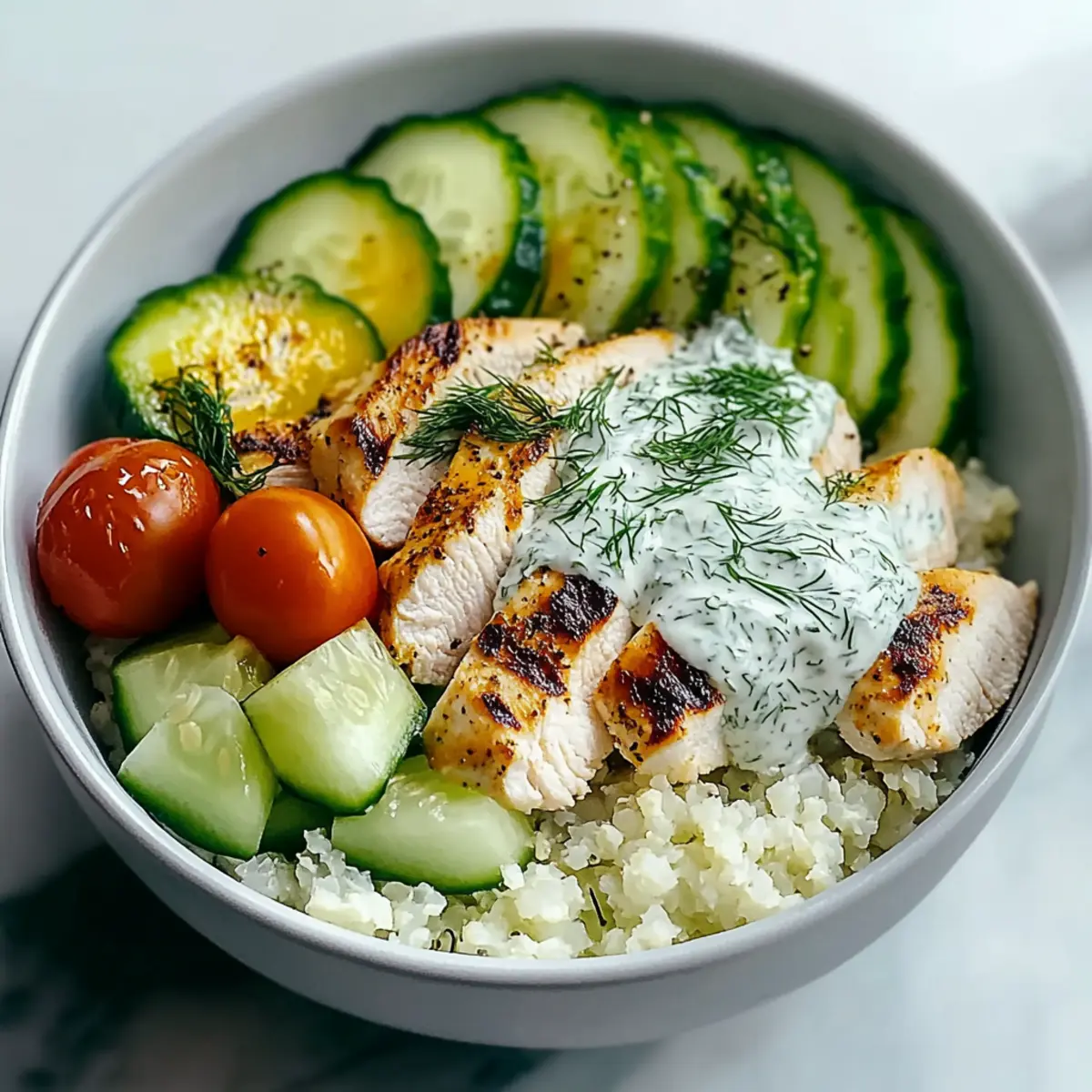 - Assemble the bowl: start with cauliflower rice, add grilled chicken slices, diced cucumber, sliced avocado, and quartered tomatoes.