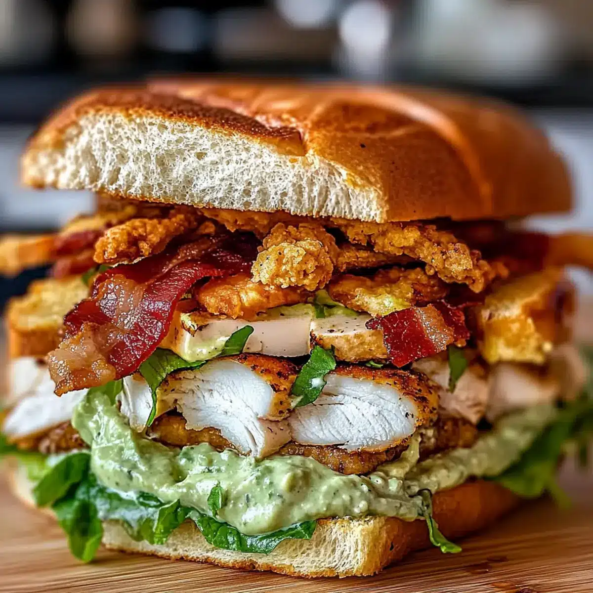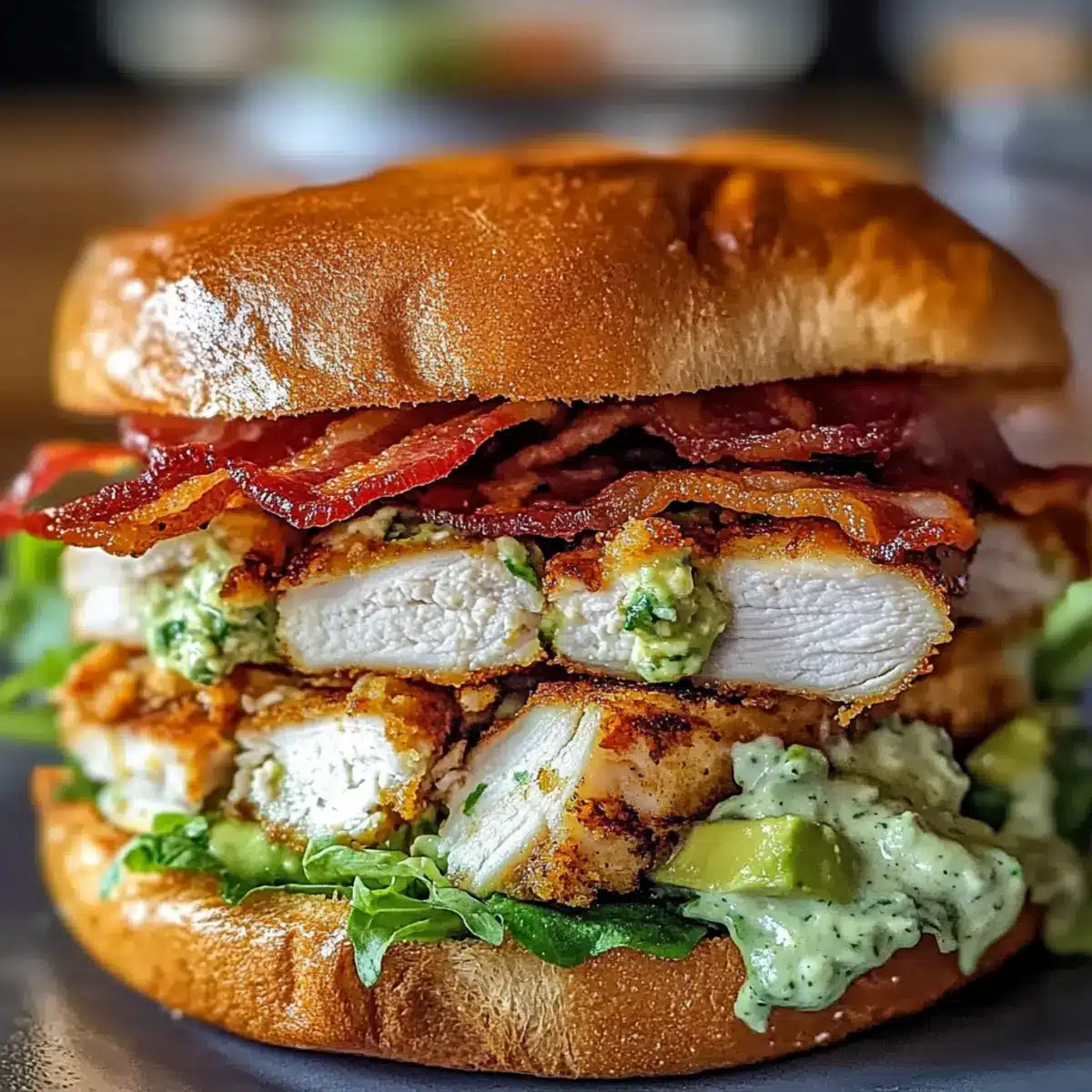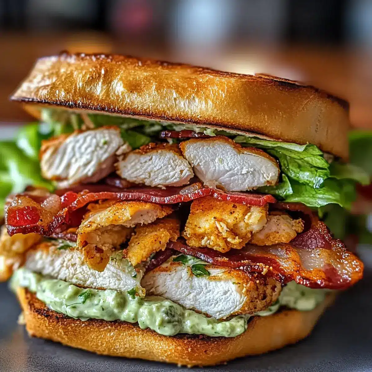 - Assemble the Sandwich: Spread avocado ranch on toasted slices, layer with lettuce, chicken, bacon, tomatoes, and cheese, then top with bread.