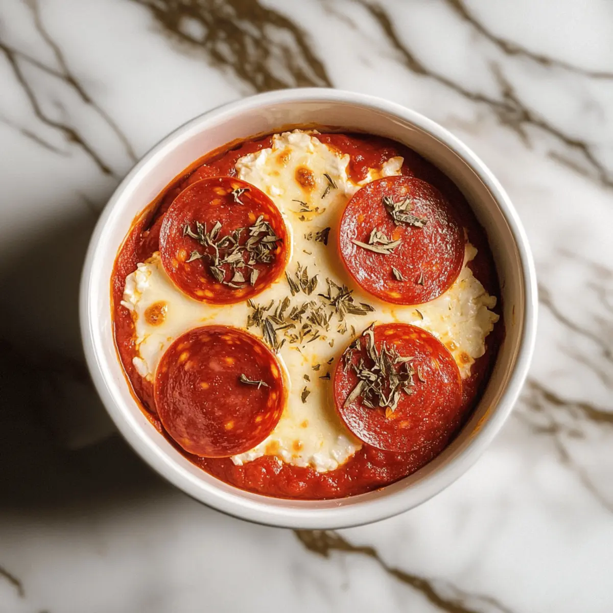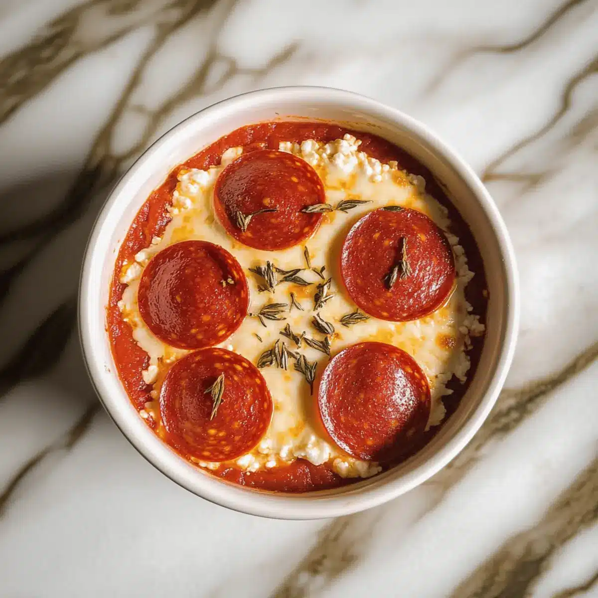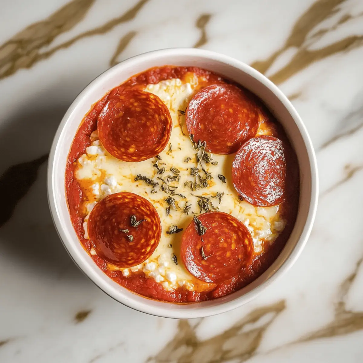 Place mini pepperoni slices on top of the cheese layer, distributing them evenly over each ramekin. Feel free to get creative here; you can swap in turkey pepperoni or even load up on veggies for a vegetarian twist. These toppings will deliver that beloved pizza taste, making your Low-Carb Cottage Cheese Pizza Bowls a fulfilling meal.