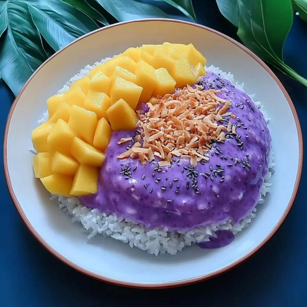 To serve, spoon a generous portion of the Mango Ube Sticky Rice onto a plate, then artistically arrange the fresh mango slices on top. Drizzle with the luscious coconut sauce and sprinkle with toasted coconut for added texture. Optionally, garnish with fresh mint leaves for a pop of color. Each serving is a beautiful presentation of tropical delight!