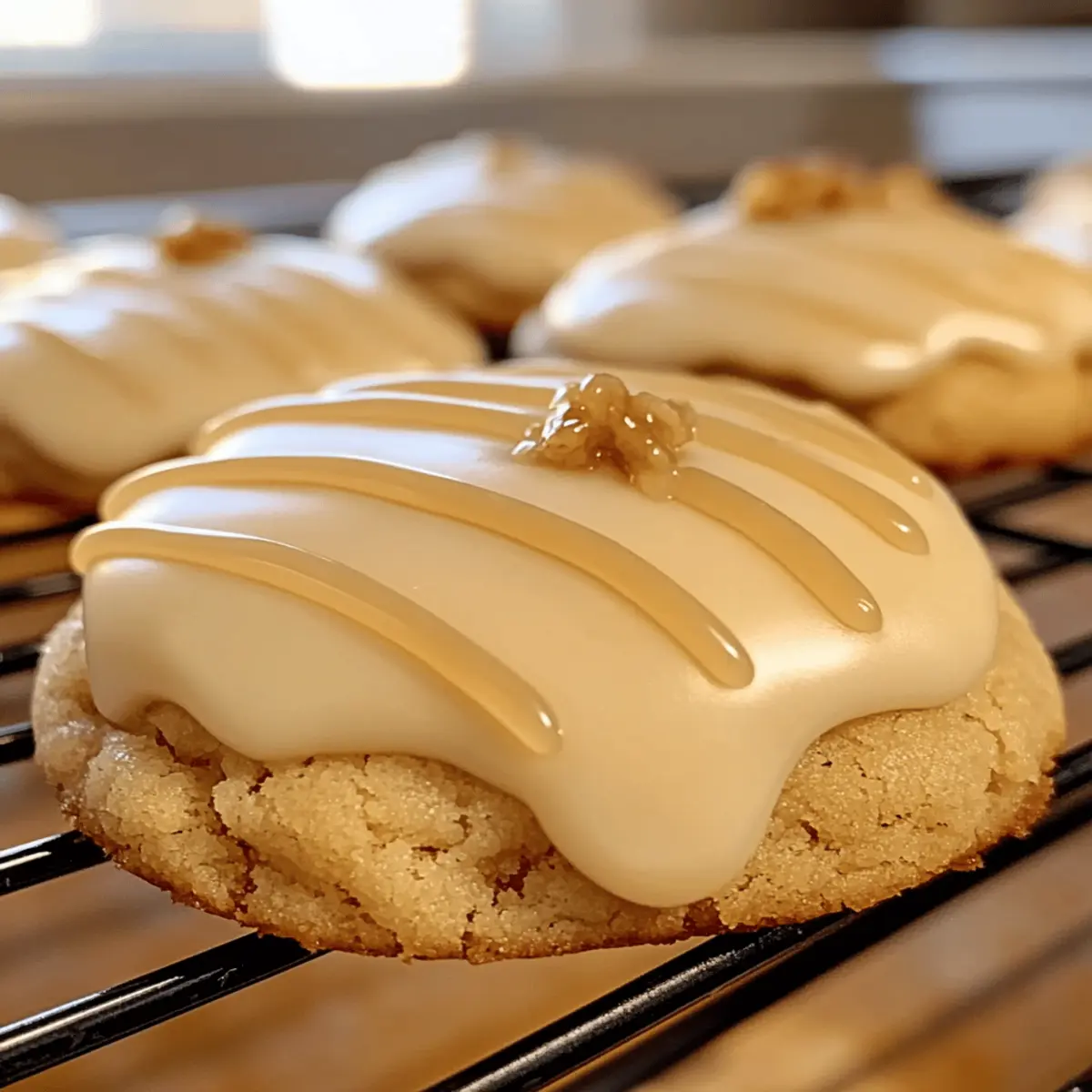 Once the cookies are completely cool, spread the silky maple icing over each cookie using a small spatula or the back of a spoon. Work quickly, as the icing thickens as it cools. After icing, allow them to set at room temperature before storing to ensure the icing remains intact and glossy.