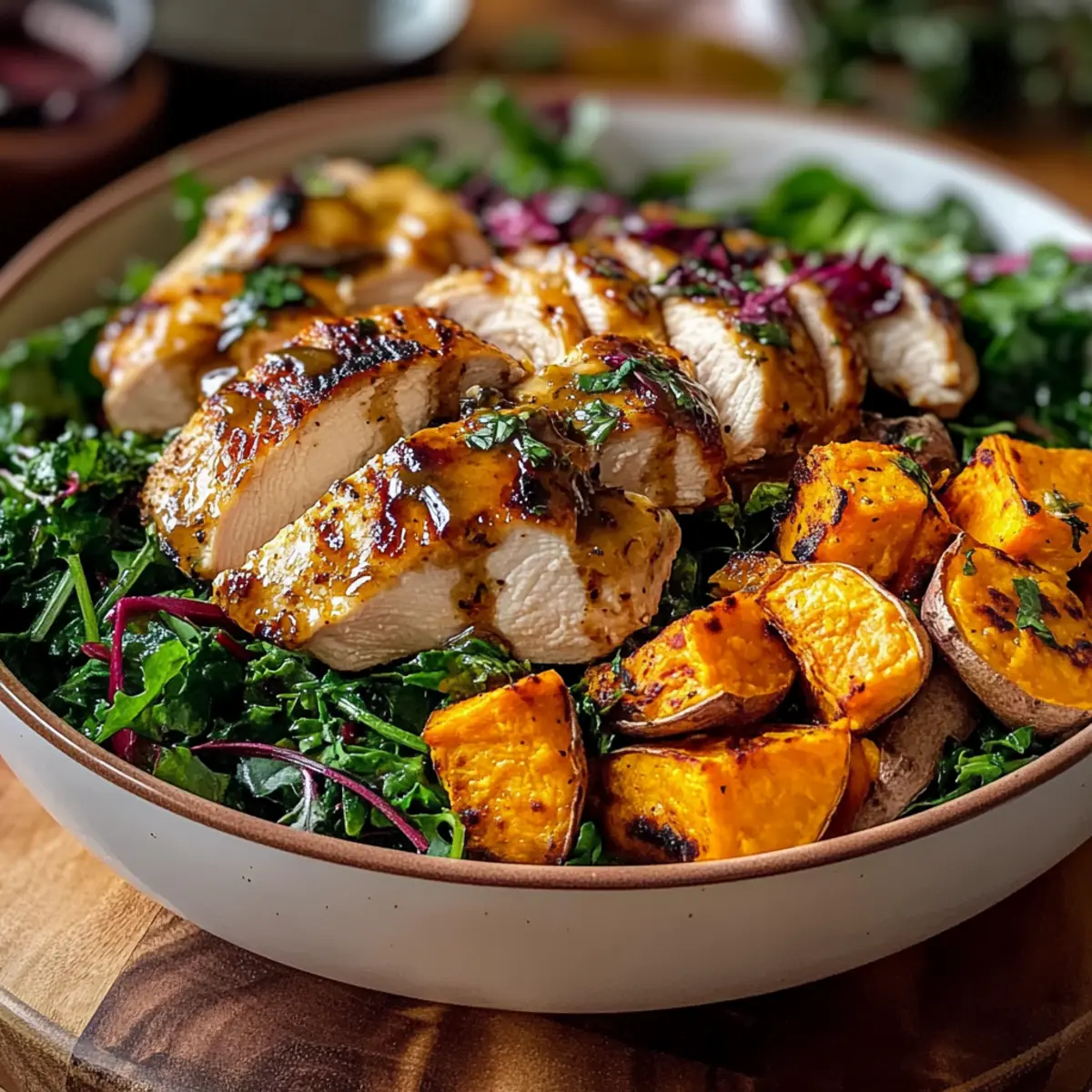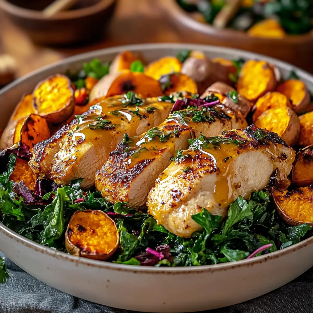 - Layer roasted sweet potatoes, chicken slices, and earthy greens in bowls.