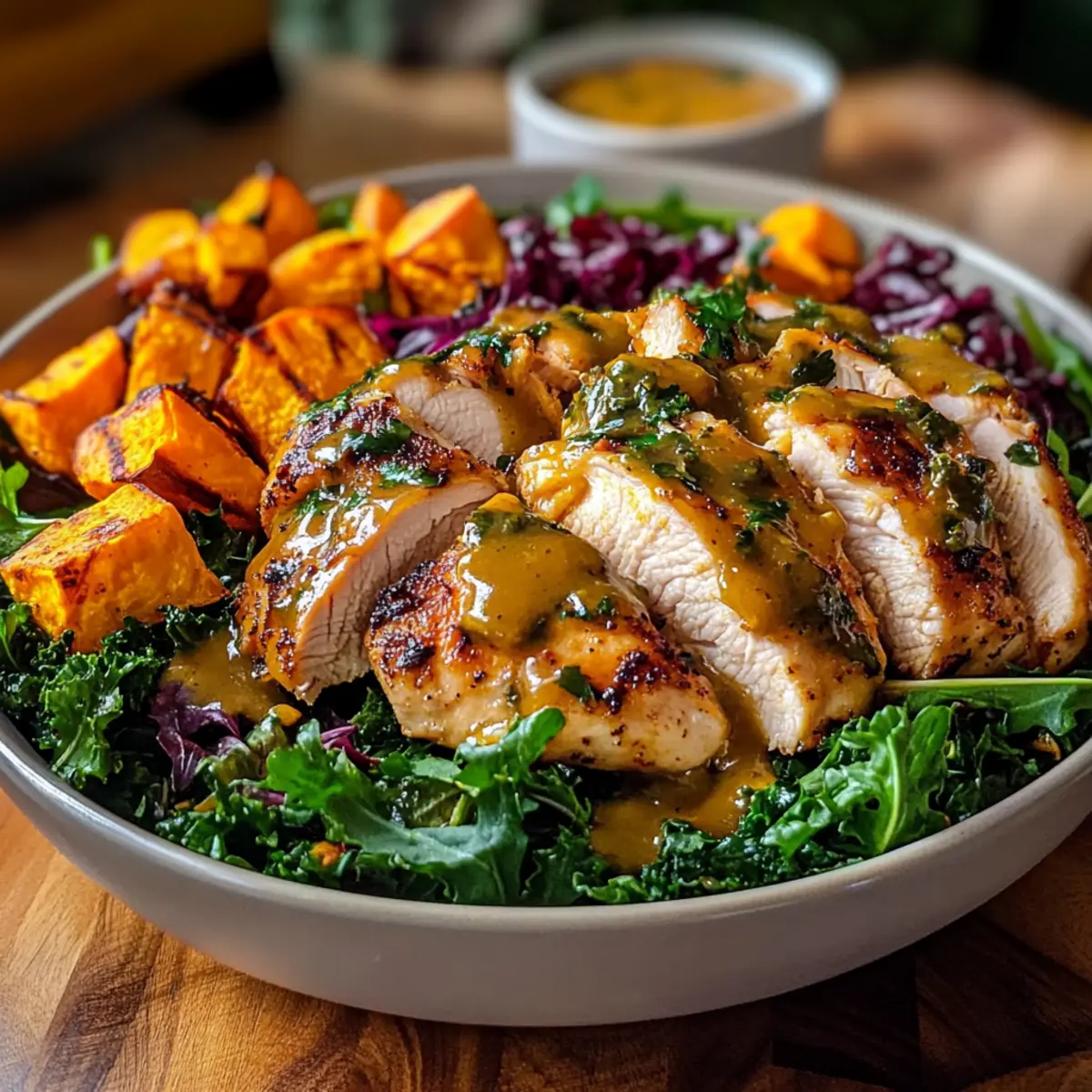Once everything is cooked to perfection, it’s time to assemble your bowls! Start by layering the roasted sweet potatoes at the bottom, followed by slices of the Maple Dijon chicken. Add a generous handful of earthy greens such as spinach or kale on top, enhancing the visual appeal and nutritional value of your meal.