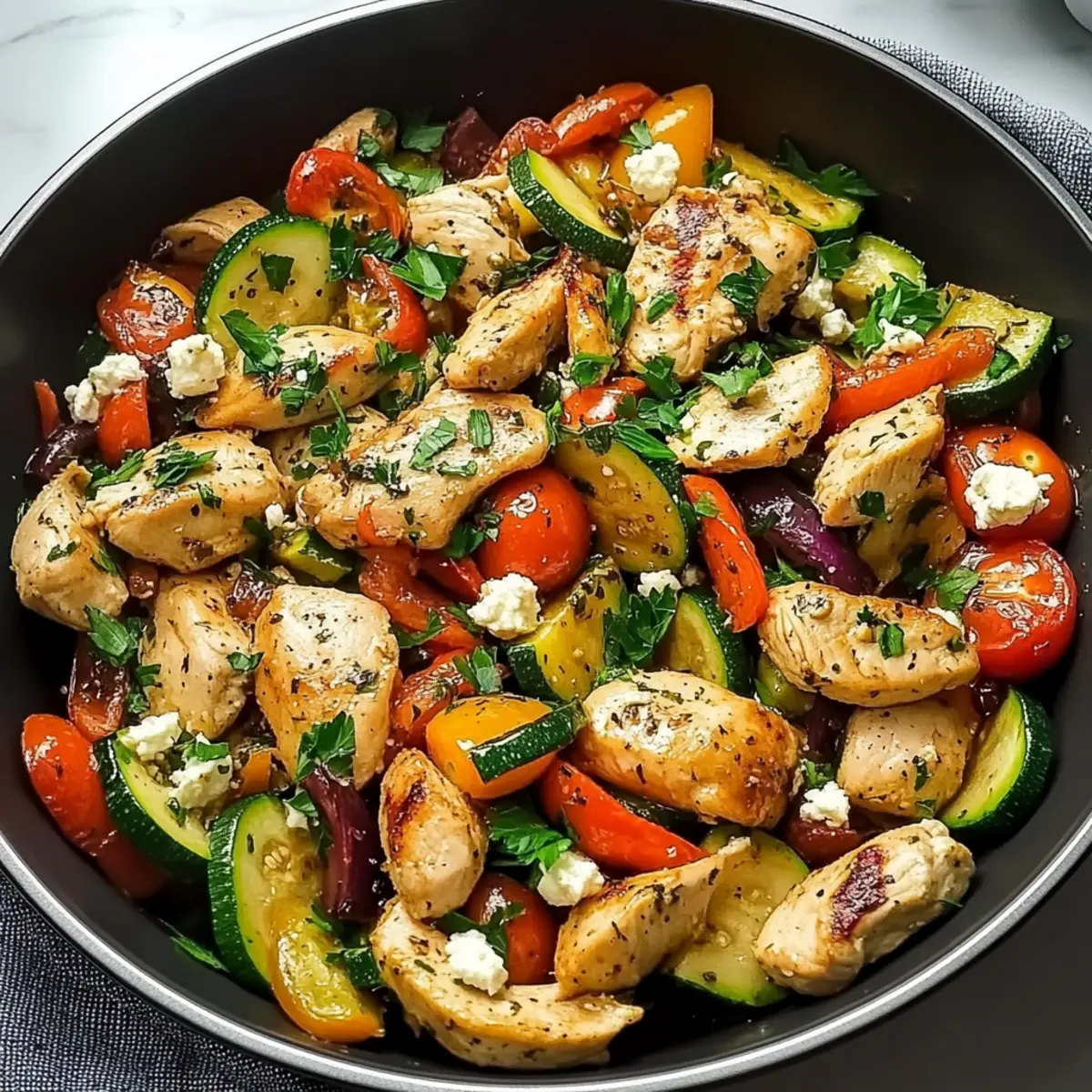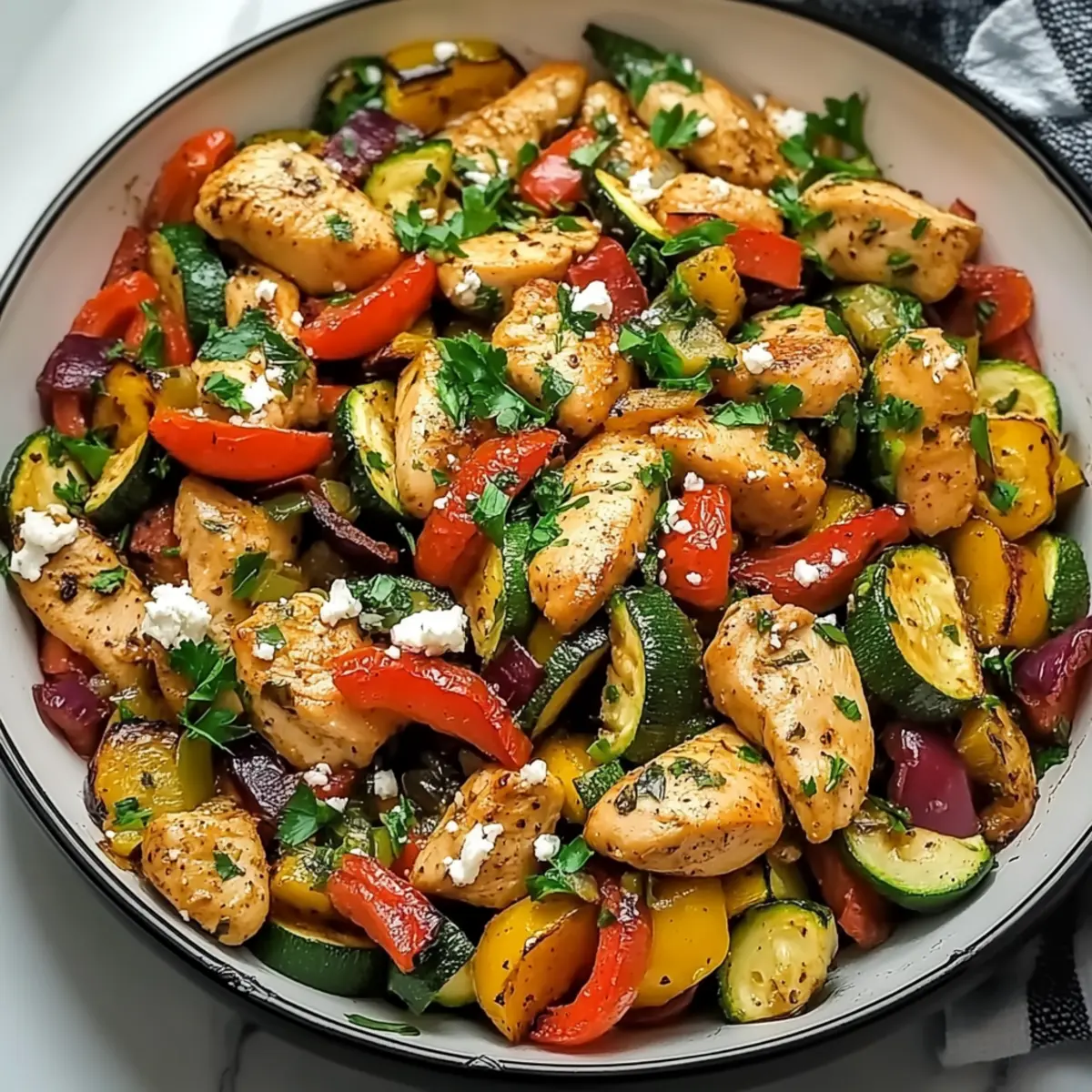 Certainly! To make the Mediterranean Chicken Stir Fry allergy-friendly, substitute the feta cheese with a dairy-free alternative or simply omit it for a nutritious, lactose-free dish. Moreover, if you’re preparing this for pets, avoid feeding them any cooked garlic or onions, as these can be harmful to them.
