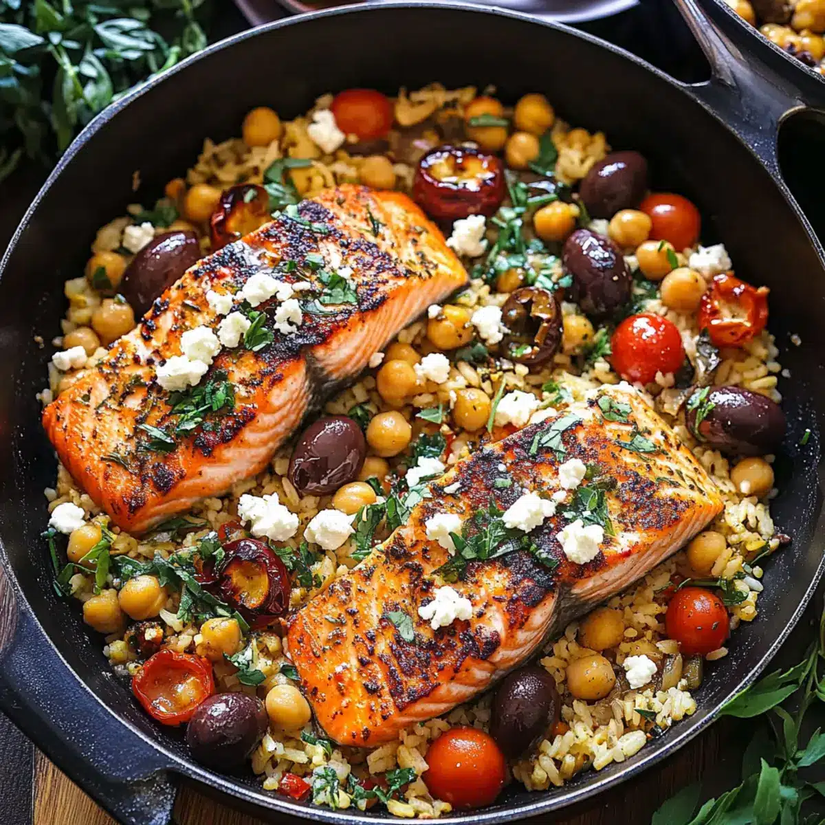 Preparing your Mediterranean Salmon ahead of time is a fantastic way to streamline meal planning for busy weeknights! You can season the salmon fillets with smoked paprika, dried oregano, and salt, then wrap them tightly and refrigerate for up to 24 hours to keep them fresh. Additionally, you can cook the jasmine rice and chickpeas mixture, storing it in an airtight container in the fridge for up to 3 days. When you’re ready to serve, simply reheat the rice mixture in a skillet over medium heat, cook the salmon until warmed through, and top with the prepared feta mixture. This ensures a delicious meal with minimal effort, allowing you to enjoy the vibrant flavors without the rush!