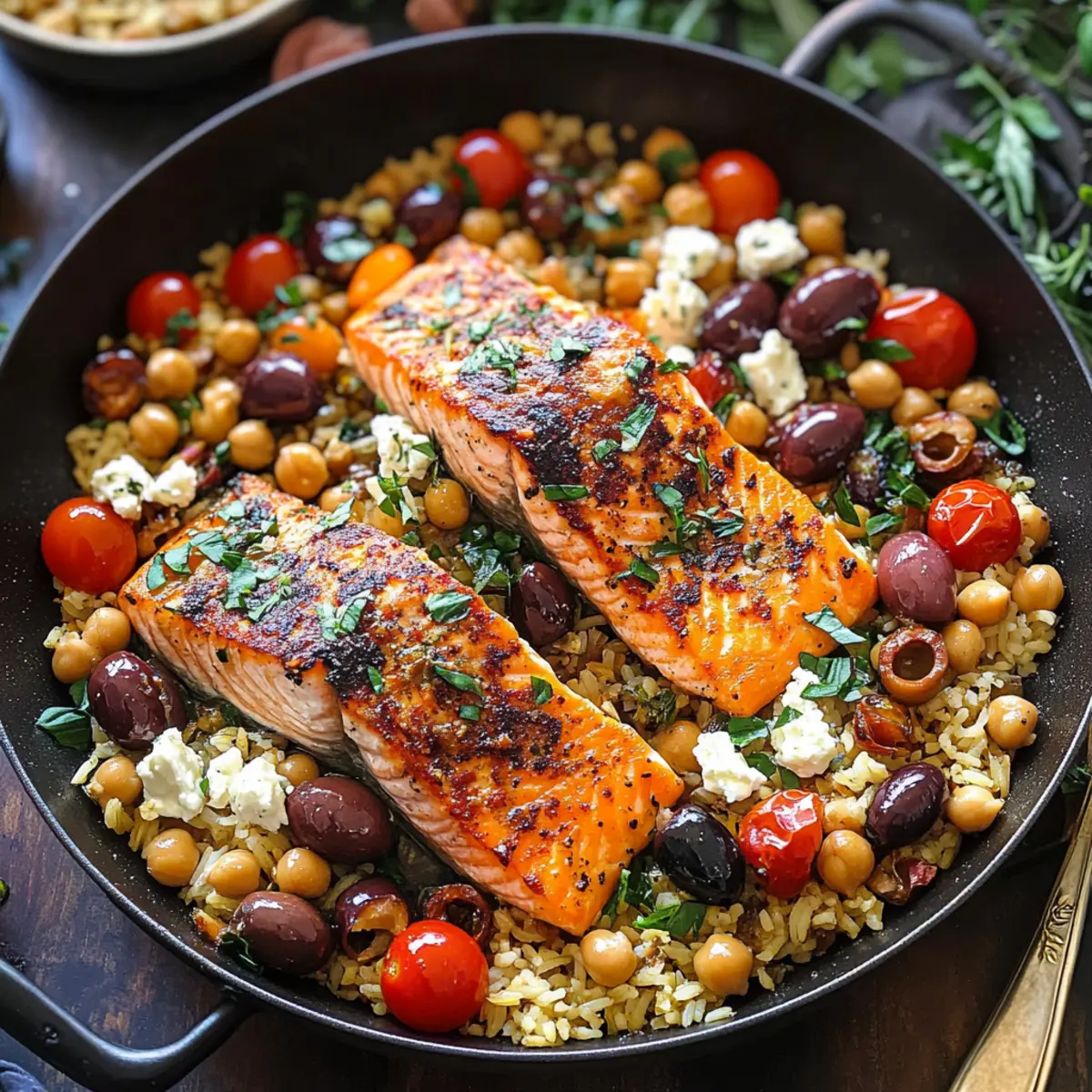 “Amidst the chaos of everyday cooking, I found myself in a mini crisis: how to whip up a meal that’s not only healthy but also delicious in under 30 minutes. Enter my One-Pan Mediterranean Salmon with Rice and Chickpeas. This vibrant dish shines with the fresh, rich flavors of tender salmon, hearty chickpeas, and colorful veggies. It’s both gluten-free and high in protein, making it an ideal option for anyone looking to nourish their body without sacrificing taste. Whether you’re navigating a busy weeknight or hosting friends for a special dinner, this recipe is a real game changer. Trust me, your taste buds are in for a delightful treat! Are you ready to make your next meal a Mediterranean masterpiece?”