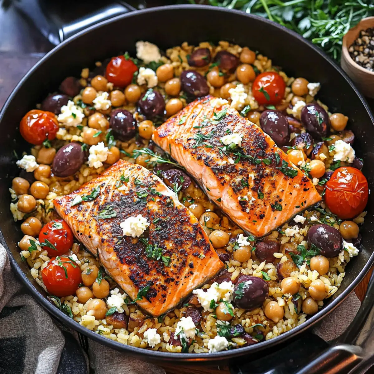 - Assemble: Stir half of the feta mixture into the rice and chickpea blend. Place cooked salmon back into the skillet and top with the remaining feta mixture.