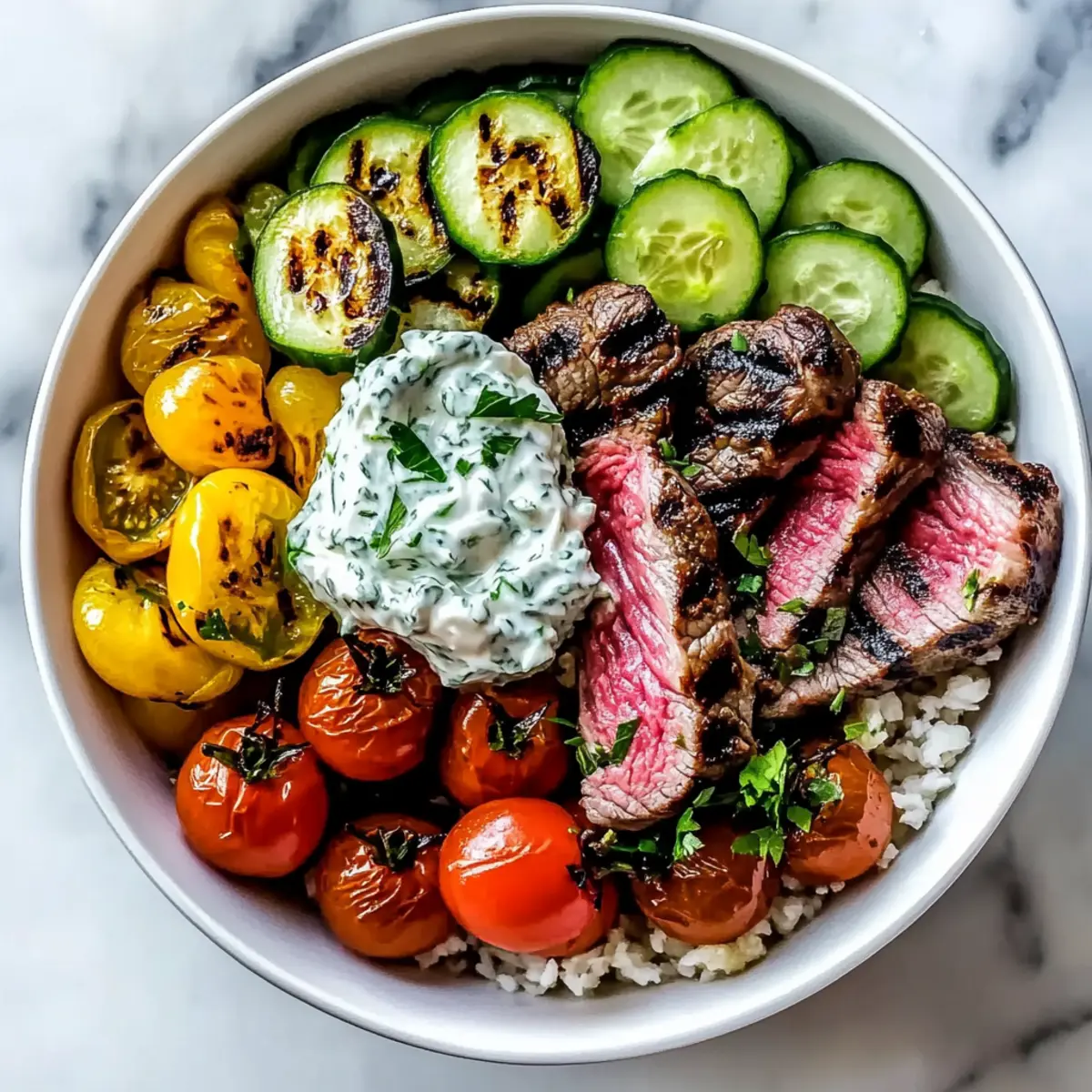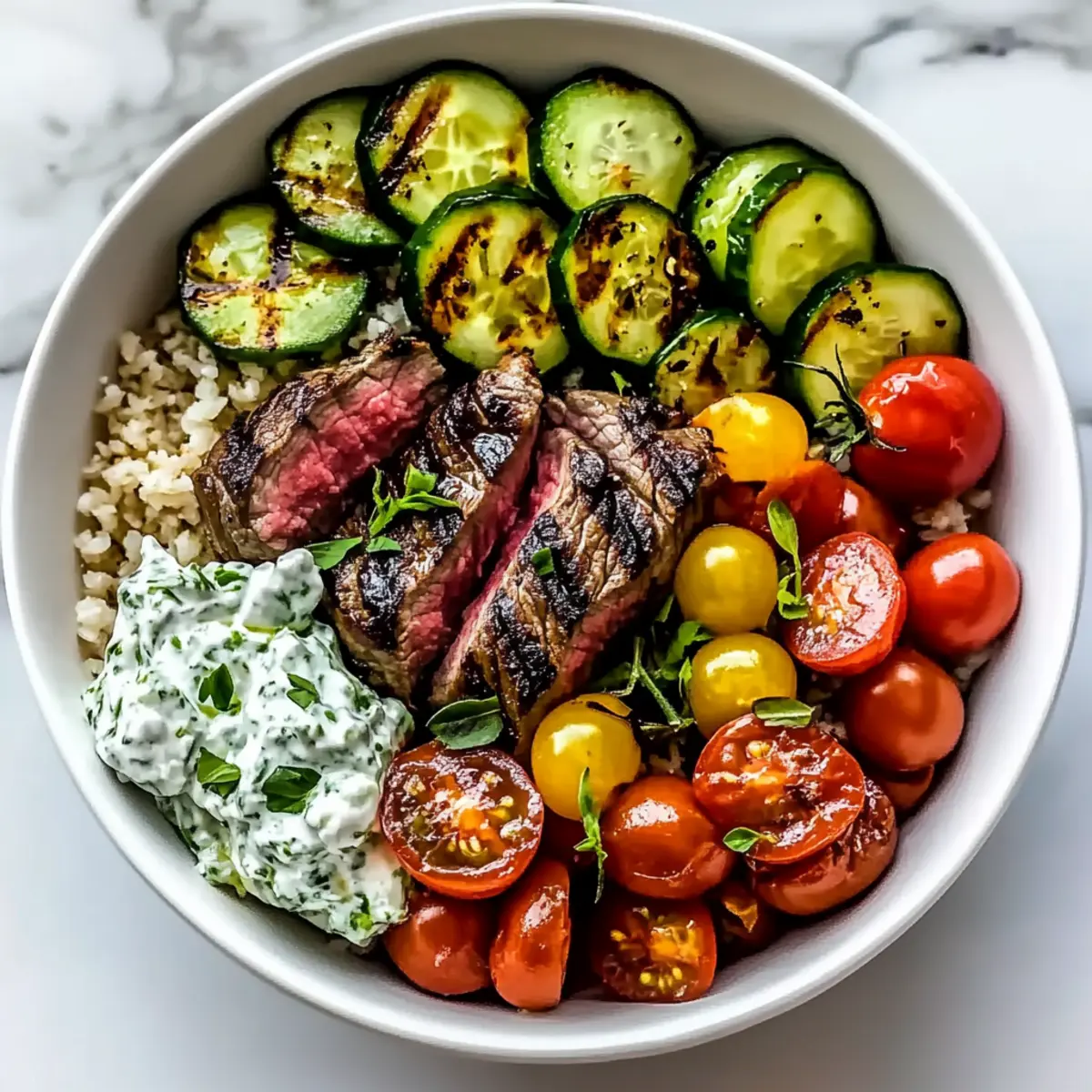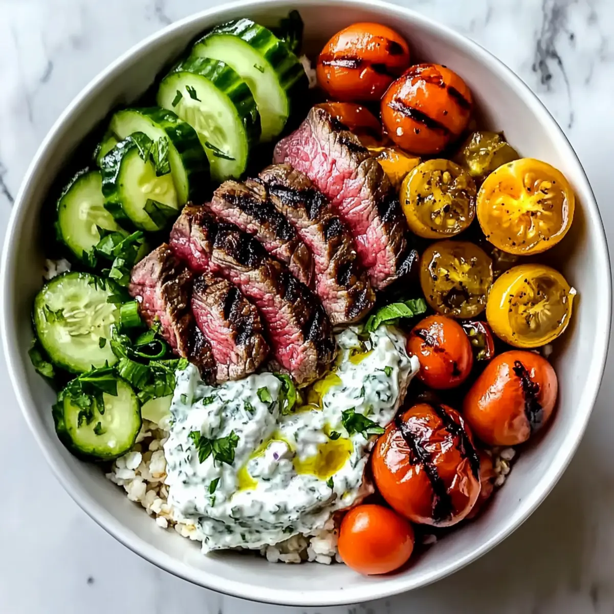 To assemble the Mediterranean Steak Bowl, place the sliced steak on top of the prepared grains and vegetables. Generously dollop the tzatziki sauce over the steak, and drizzle with the zesty vinaigrette. Finish with a sprinkle of feta cheese and fresh herbs. Your vibrant Mediterranean Steak Bowl is ready to be enjoyed!