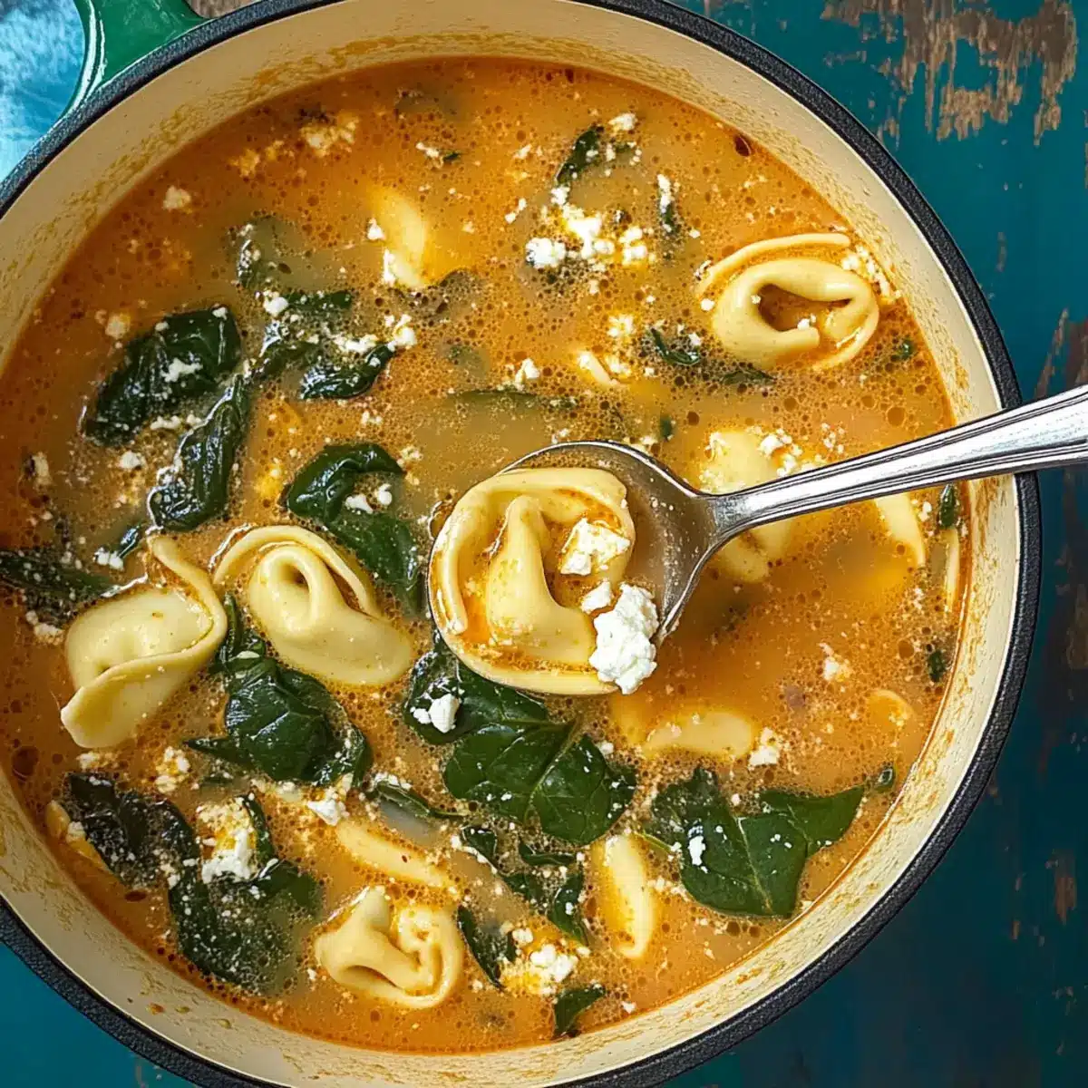 After the tortellini has cooked, reduce the heat and add 4 cups of fresh spinach leaves along with 1 cup of crumbled feta cheese. Pour in a splash of heavy whipping cream if you desire extra richness. Simmer the mixture for about 5 minutes, allowing the spinach to wilt and the flavors to meld beautifully.