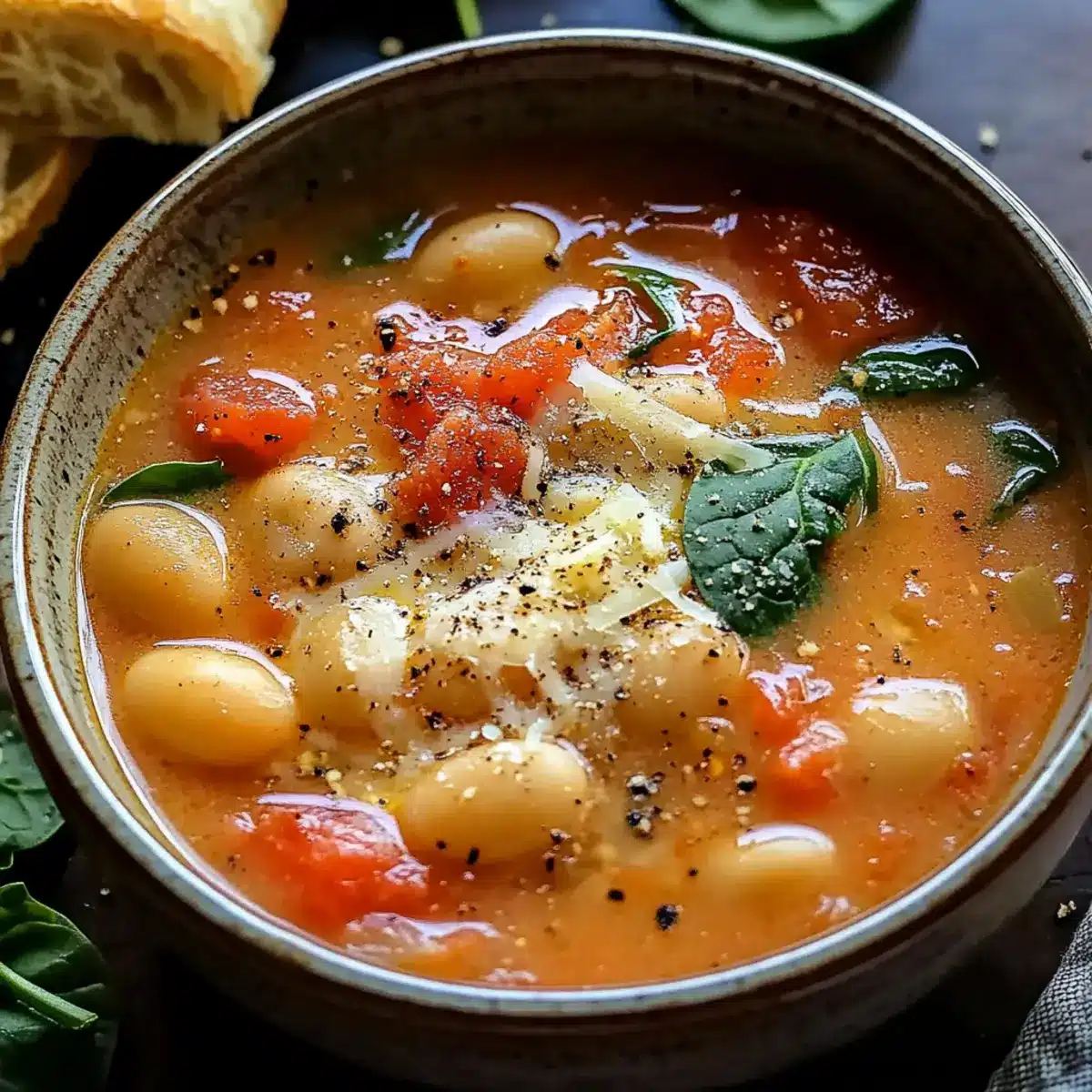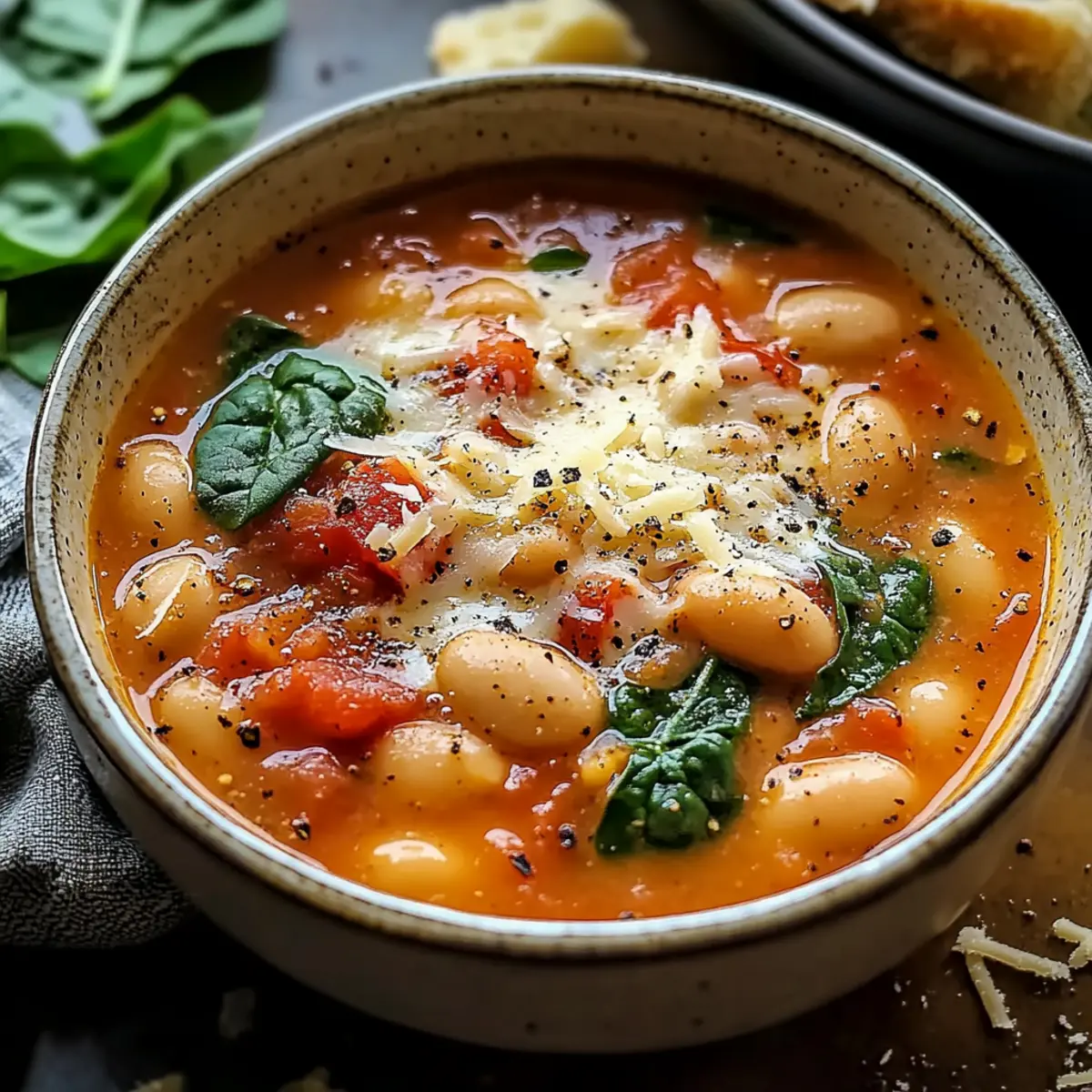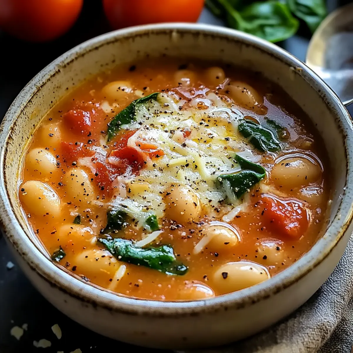 A warm and inviting Parmesan Tomato Cannellini Bean Soup, perfect for chilly nights and easily adaptable for dietary preferences.