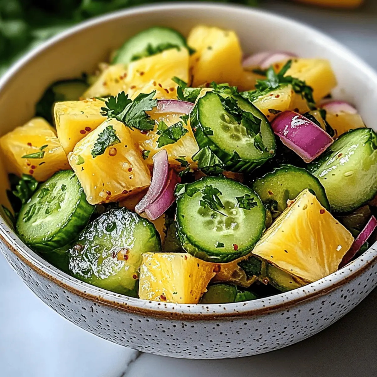 Before serving, sprinkle freshly chopped cilantro or mint leaves over the salad for a burst of color and added aroma. If desired, serve the Pineapple Cucumber Salad in a shallow bowl, showcasing the vibrant ingredients. This final touch not only elevates presentation but also introduces an extra layer of freshness that makes this dish perfect for any summer gathering or as a healthy snack.