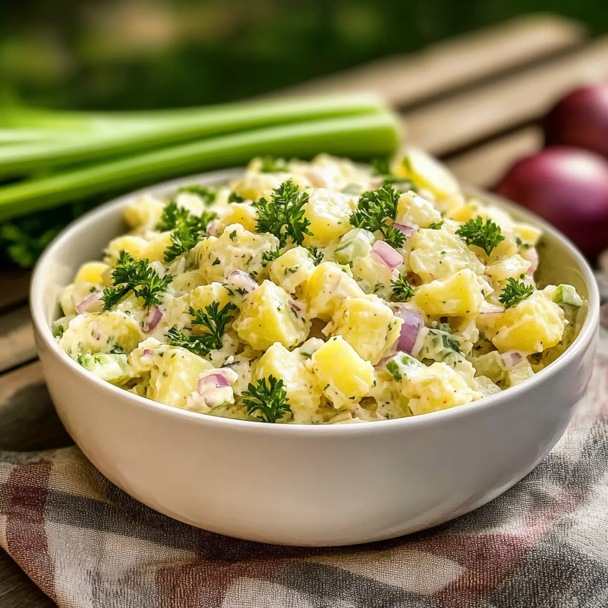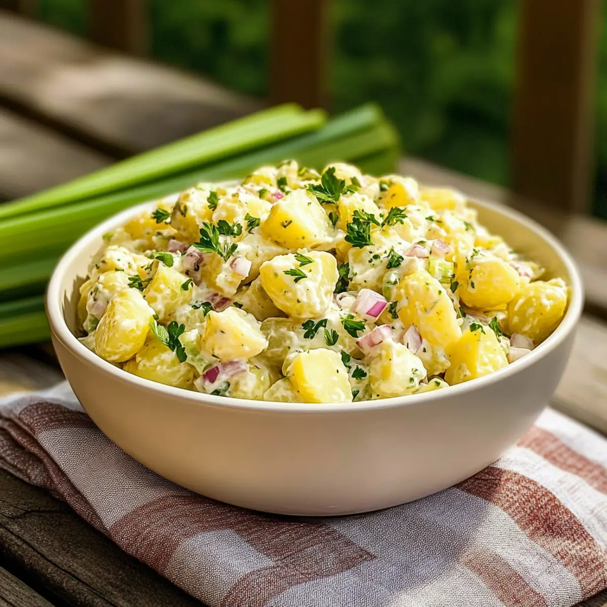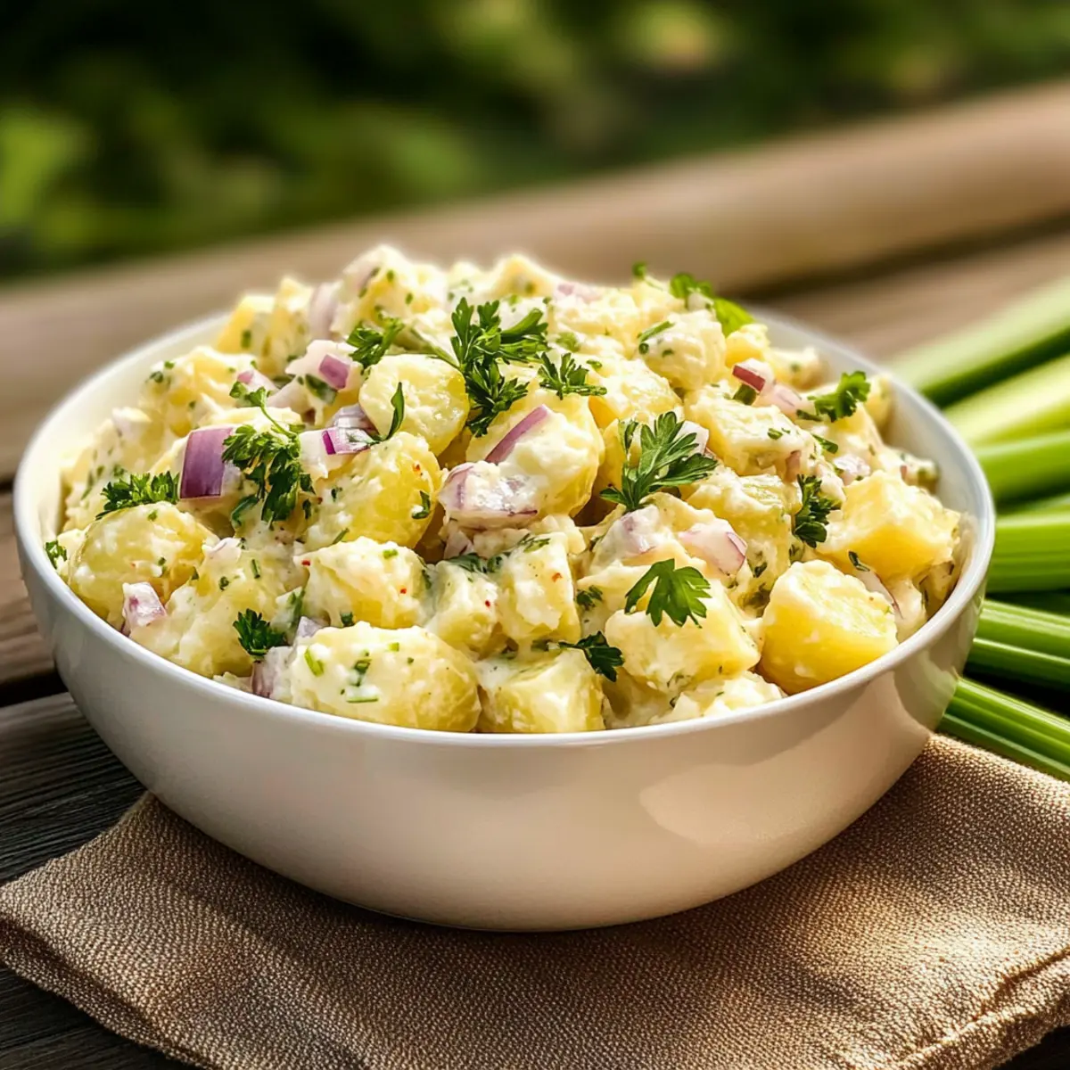 Summer gatherings and family picnics are the perfect backdrop for a spread that includes this creamy potato salad, evoking warmth and togetherness.