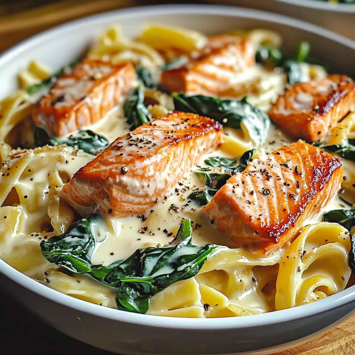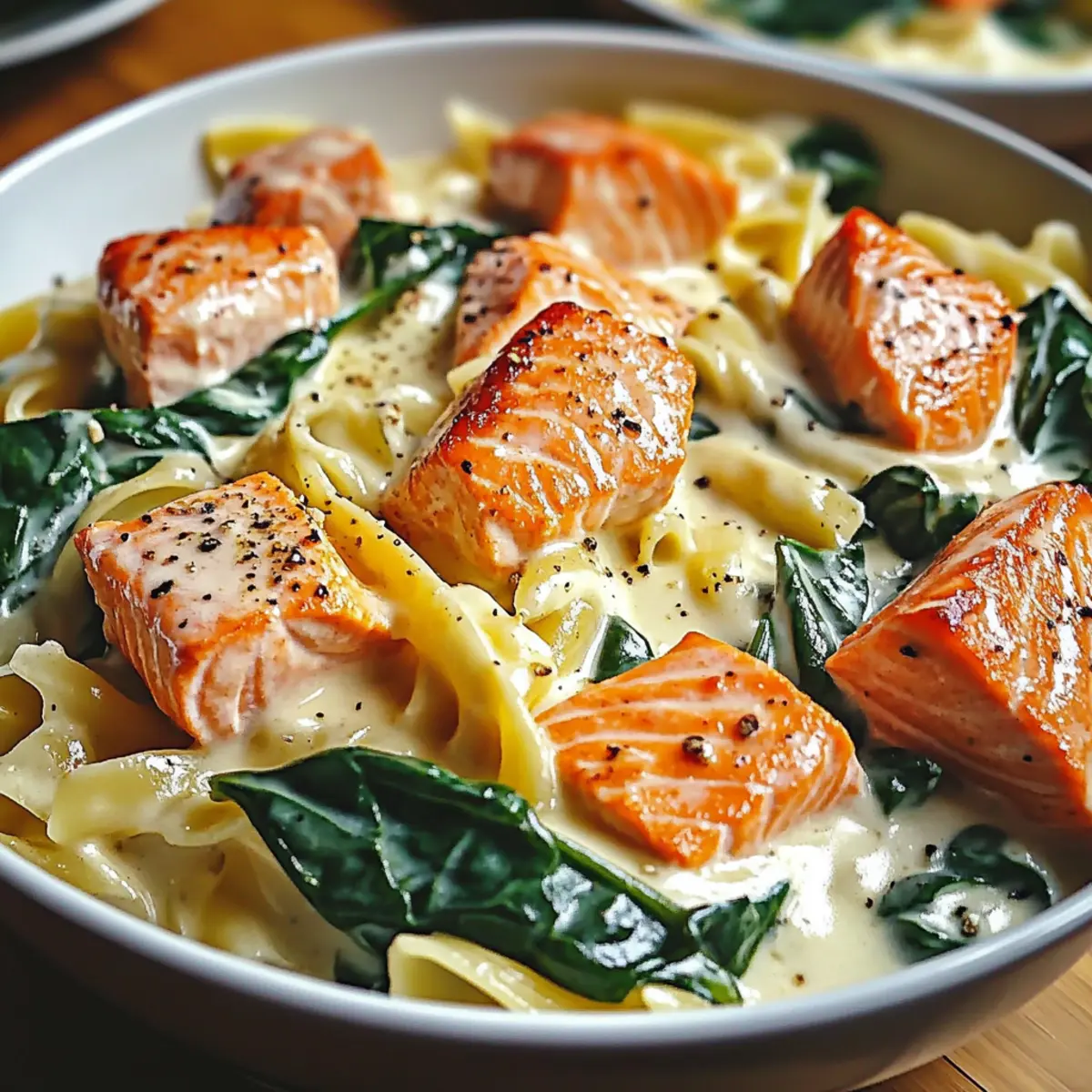As I flipped through my favorite cookbook on a rainy afternoon, I stumbled upon a recipe that I just had to try: Creamy Salmon Spinach Pasta. The thought of flaky, seasoned salmon mingling with vibrant spinach in a luscious Parmesan garlic sauce made my taste buds tingle with excitement. This quick, 30-minute dish isn’t just delicious; it’s the perfect balance of indulgence and health, making it ideal for those weeknight dinners or when you’re looking to impress guests without the fuss. Plus, it’s incredibly versatile—feel free to swap in whatever pasta you have on hand! Ready to whip up a meal that promises cozy comfort and nutrition in every bite? Let’s dive into the magic of this Salmon Spinach Pasta together!