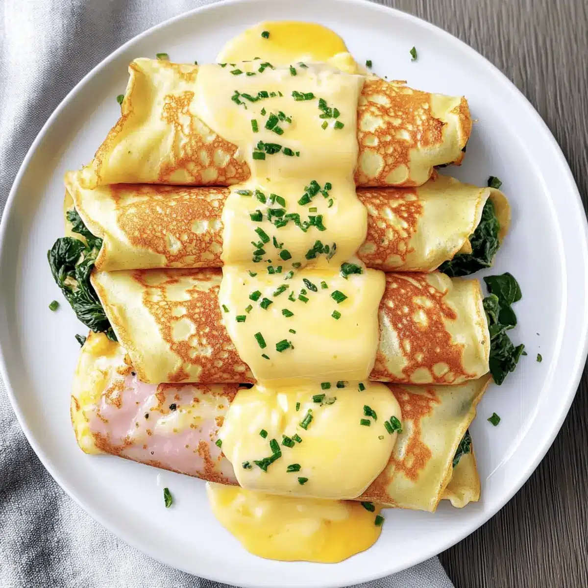 Serve your Savory Breakfast Crepes warm, garnished with fresh herbs or a sprinkle of additional cheese if desired. Pair them with a fresh green salad or seasonal fruit for a delightful brunch experience that brings warmth and flavor to your table. Each bite promises a delicious combination of creamy, cheesy goodness wrapped in a tender crepe.