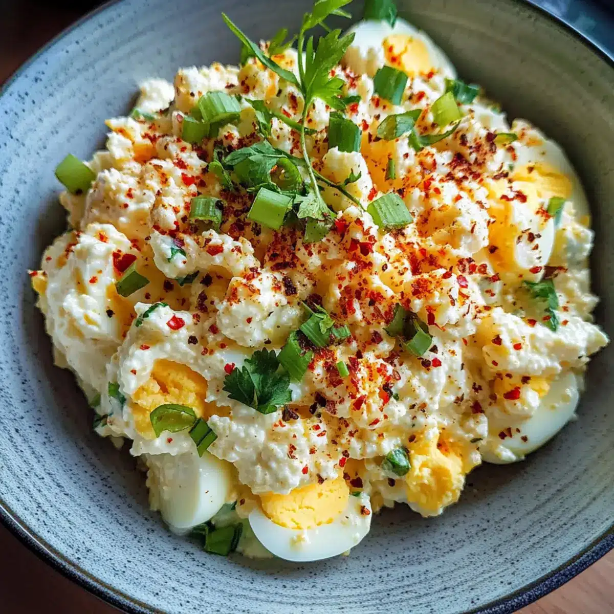 After chilling, give the salad a gentle stir, adjusting seasoning if necessary. Serve your Simple Cottage Cheese Egg Salad on whole-grain toast, in crisp lettuce wraps, or over cucumber slices for a light treat. Garnish with leftover red pepper flakes for an extra pop of color and flavor, delighting everyone at your table!