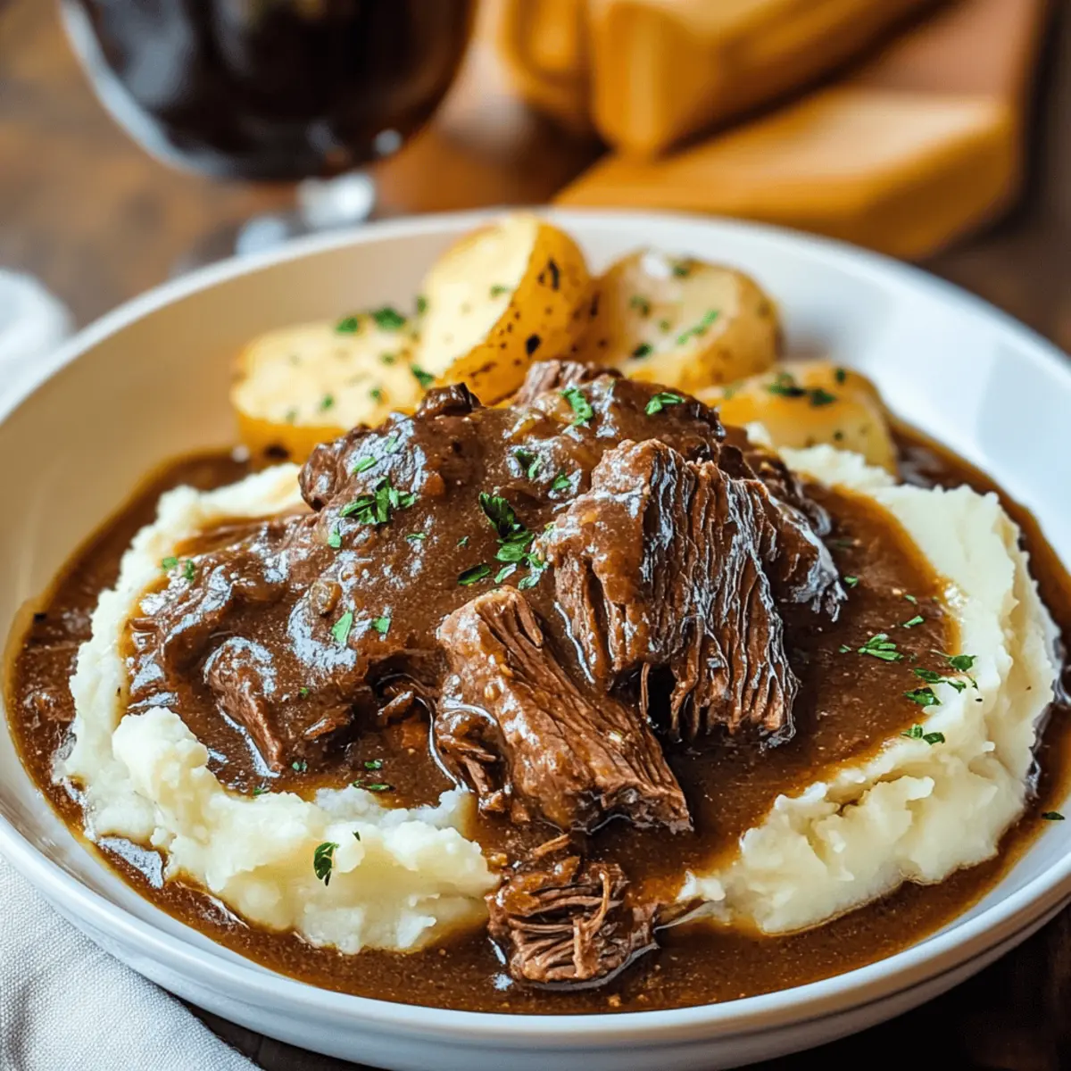6. Plate the beef with gravy over mashed potatoes and serve with garlic bread.