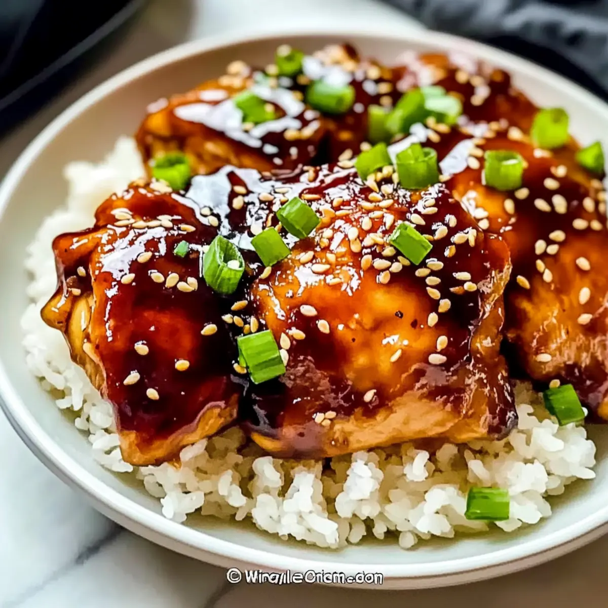 - Serve chicken with thickened sauce, garnished with sesame seeds and green onions.