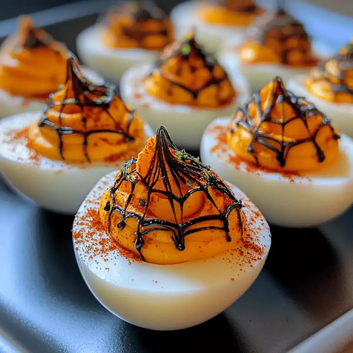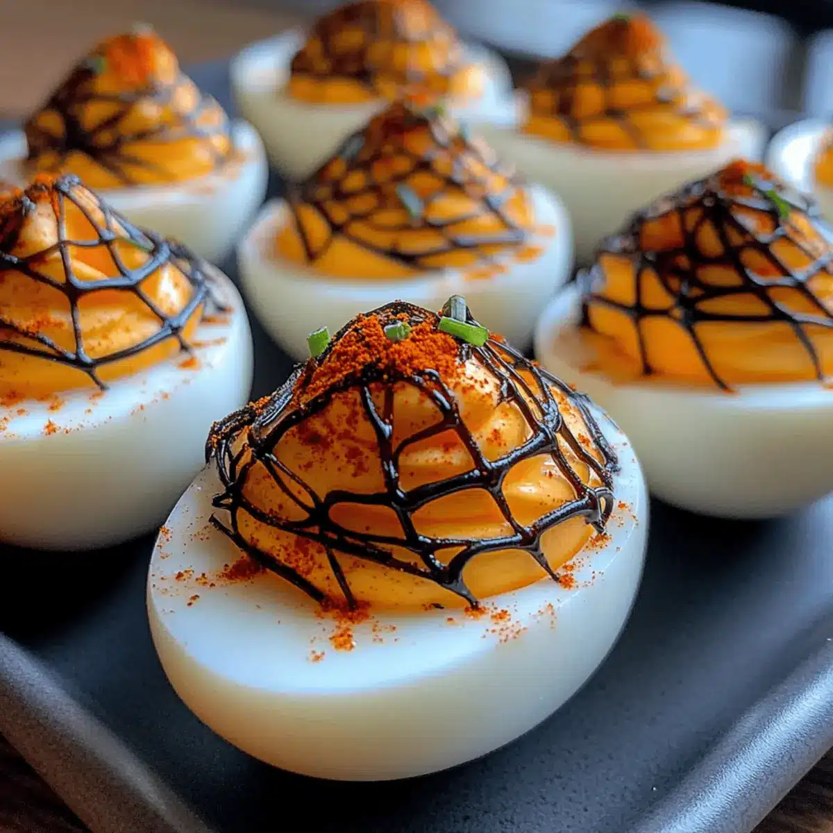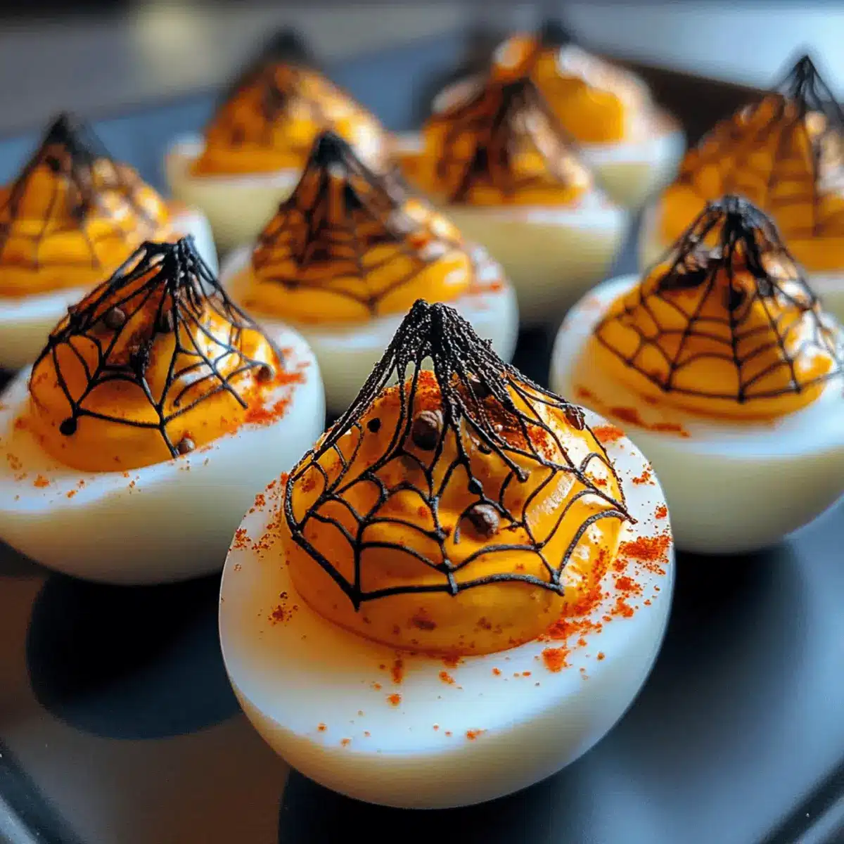 Sprinkle your assembled Spooky Spiderweb Deviled Eggs with smoked paprika for a touch of color and smoky flavor. For added spooky flair, you can top them with black sesame seeds or finely chopped chives. Serve them chilled on a Halloween-themed platter, and watch as your guests rave about these hauntingly delicious bites!