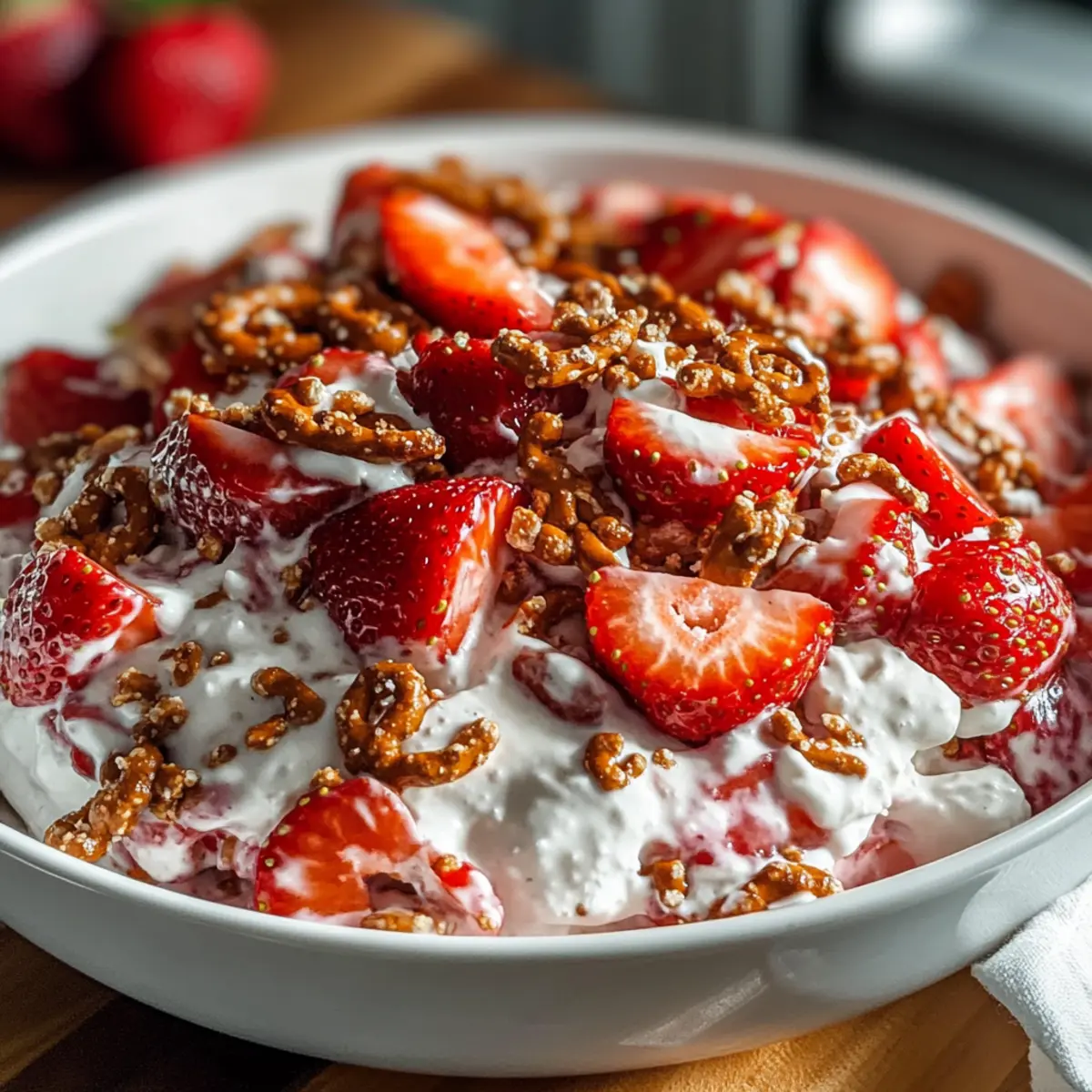 - Just before serving, fold in sliced strawberries and half of the pretzel crunch.